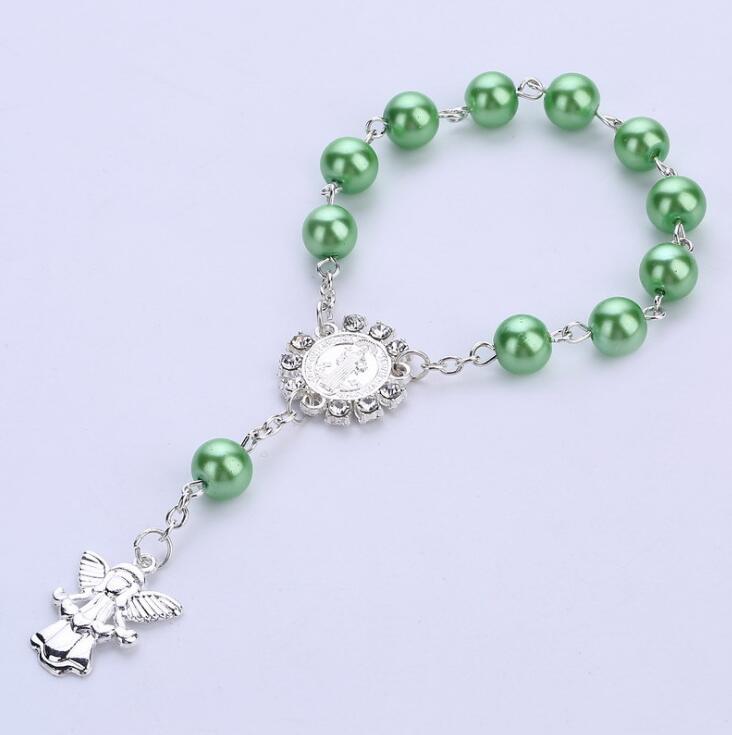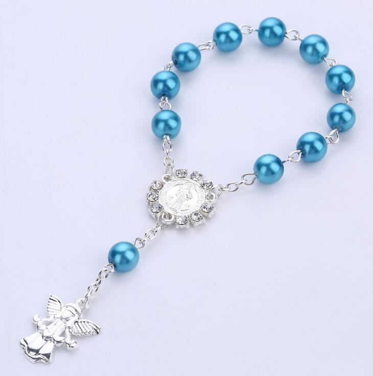 Catholic Religious Rosary Jesus Charm Bracelets for Baby Chirldren Glass Imitation Pearl Jewelry Rosary Kids Baptism Link Chains