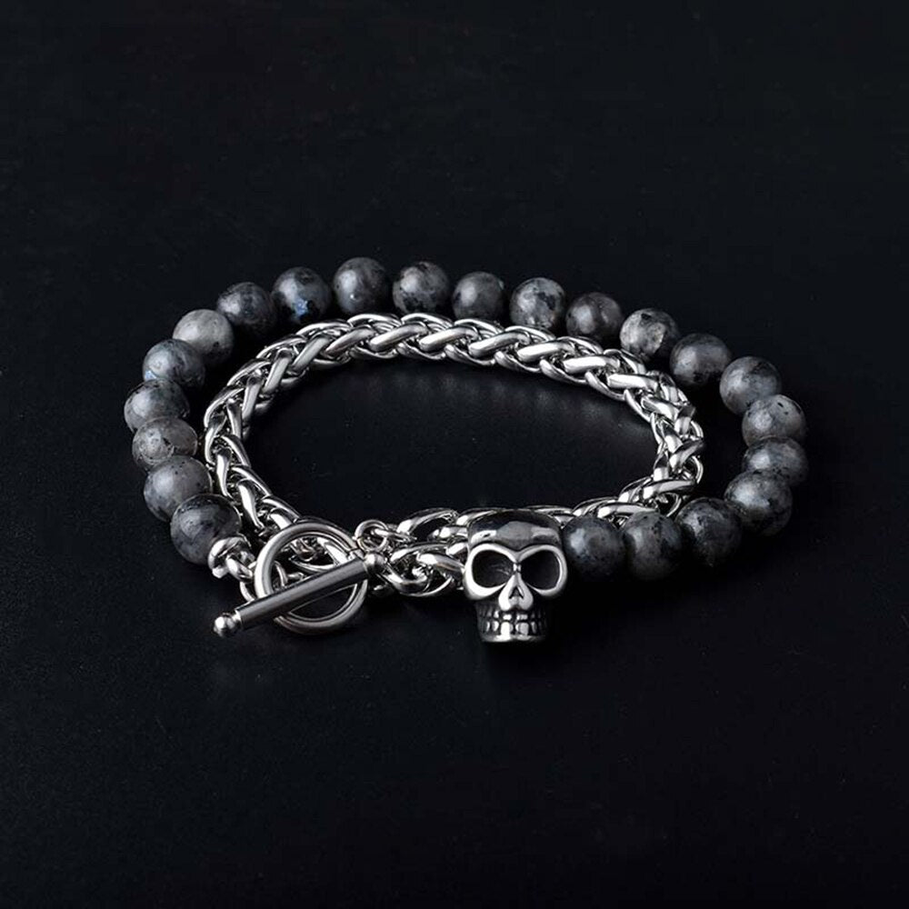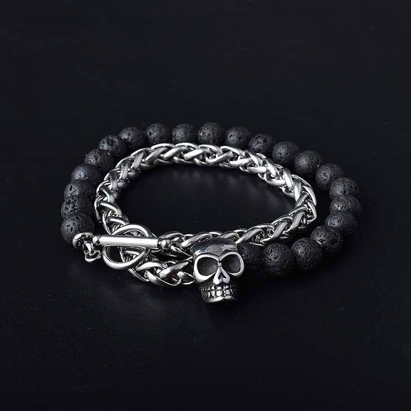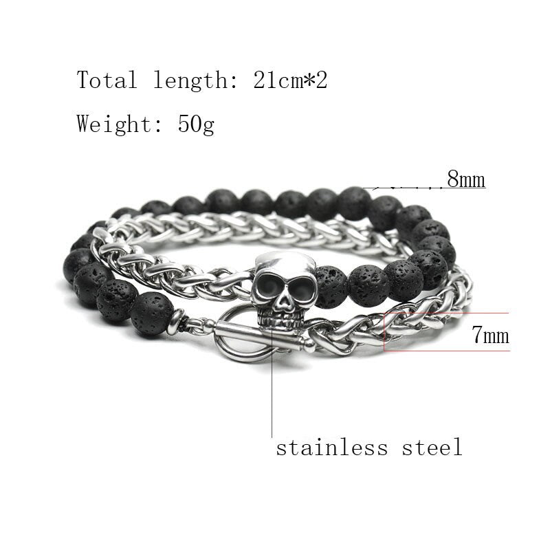 Daiiibabyyy Punk Style Natural Tiger Eye Agate Lava Stone Bead Skull Bracelet Double Layer Stainless Steel Men's Bracelet Grunge Jewelry