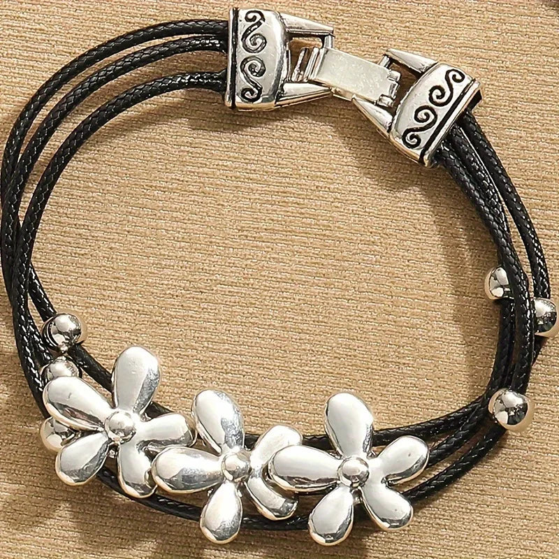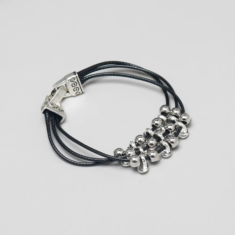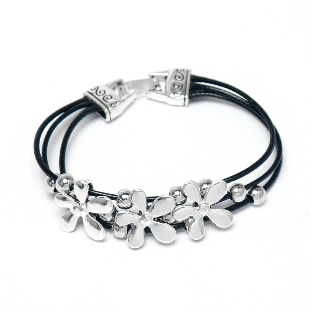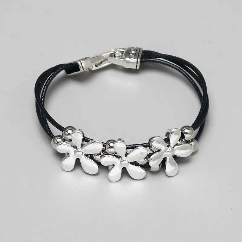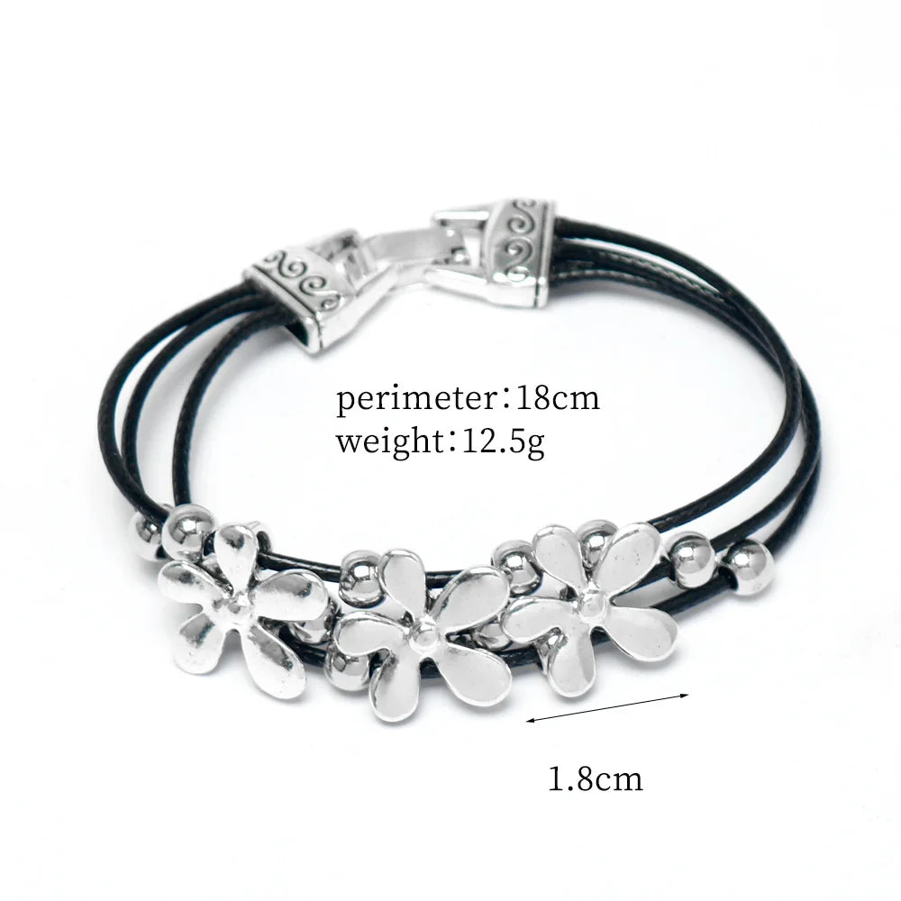 Daiiibabyyy Vintage Silver Flower Beaded Black Leather Multi-layer Bangle Bohemian Couple Friends Lucky Bracelet Jewelry Gifts
