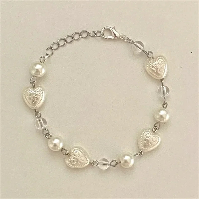 DAIIIBABYYY - White Lace Heart Charm Bracelet Handmade Pearls beaded Bracelet Coquette Aesthetic Y2K Alternative Jewelry