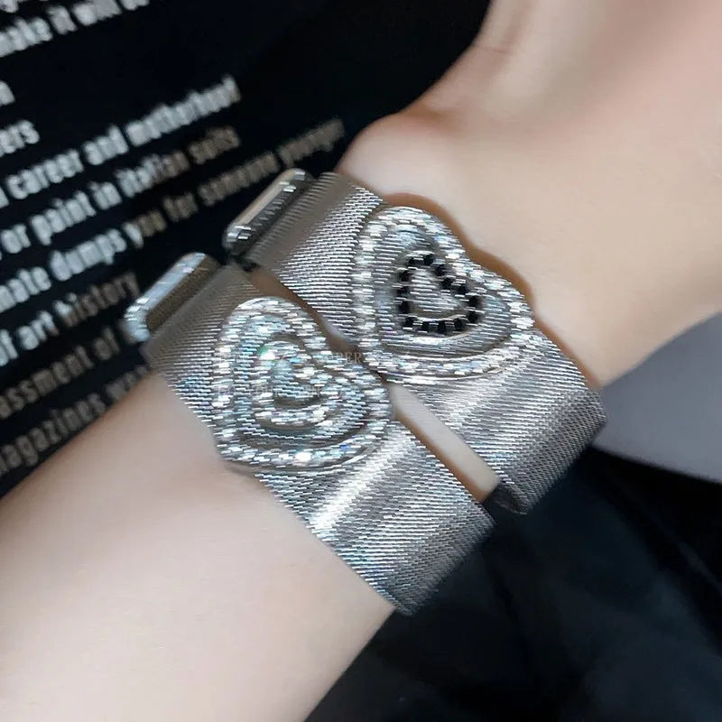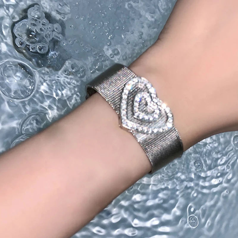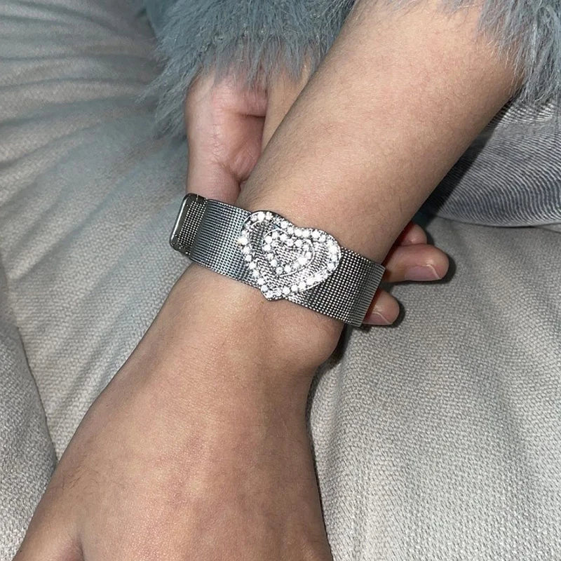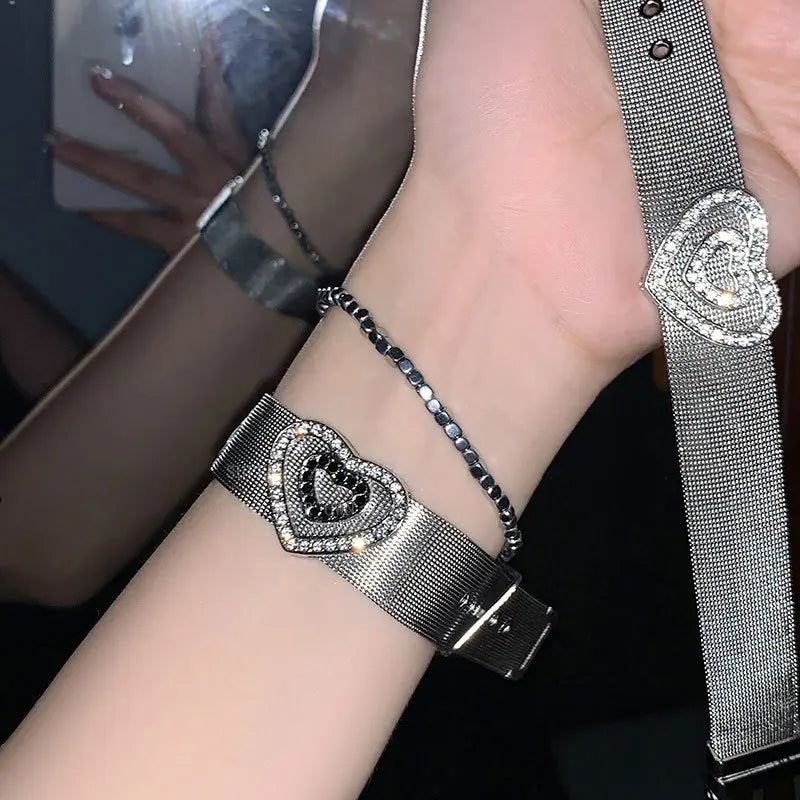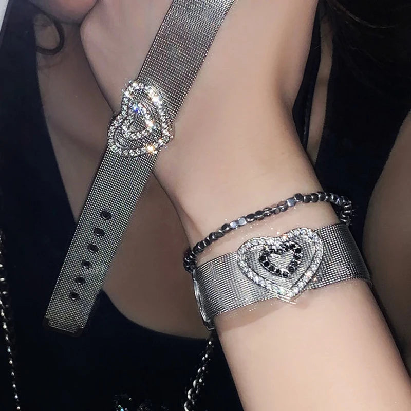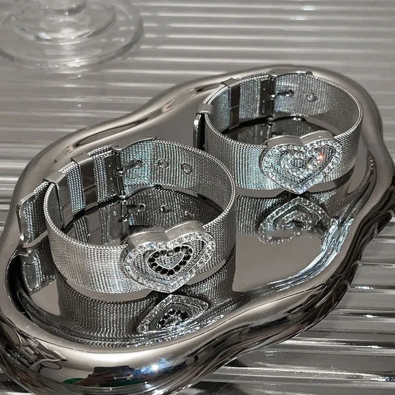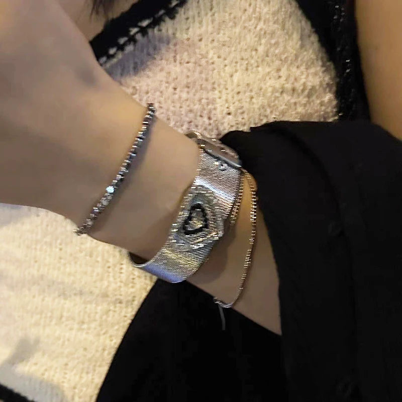 Daiiibabyyy Y2K Metal Crystal Heart Wide Bracelets for Men Women Punk Silver Color Bracelets Adjustable Wrist Belt Buckle Cuff Bangle Party