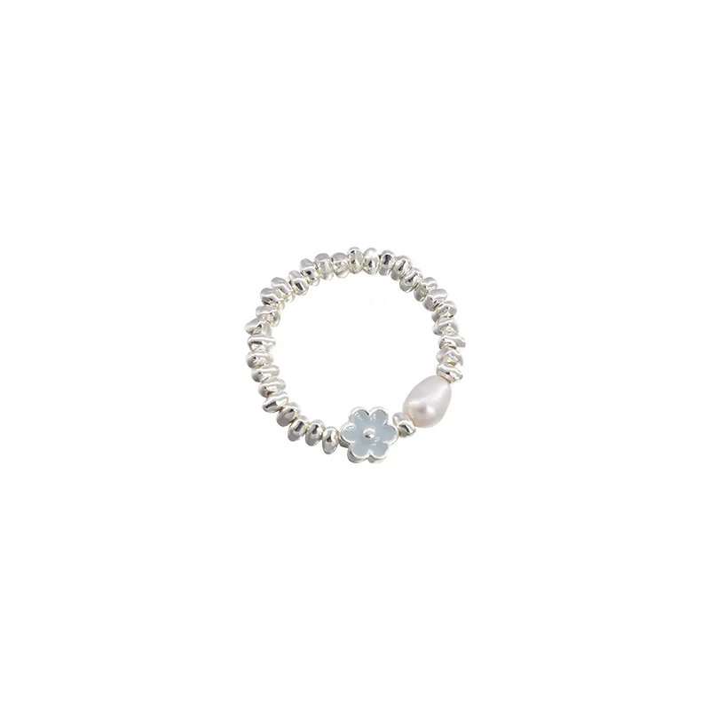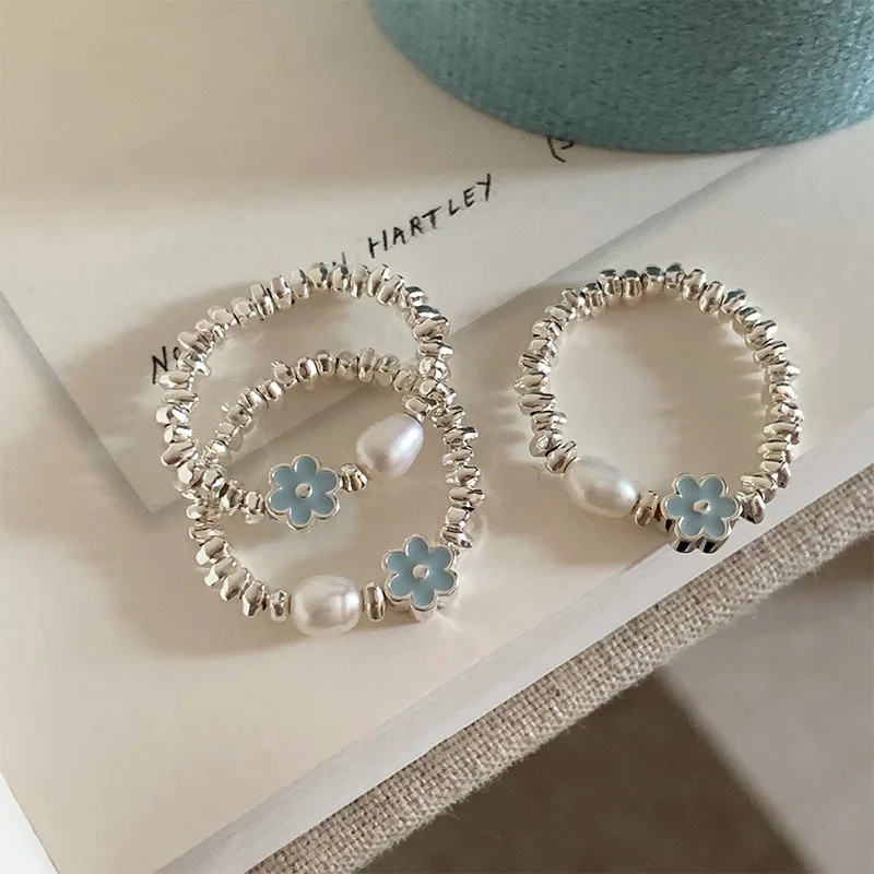 DAIIIBABYYY  -  Blue Drop Glaze Flower Pearl Rings For Women Girls Minimalist Sweet Cute Creative Temperament Elegant Birthday Jewelry