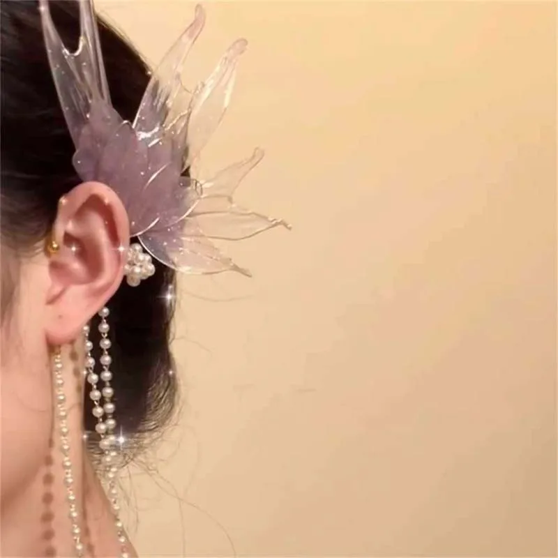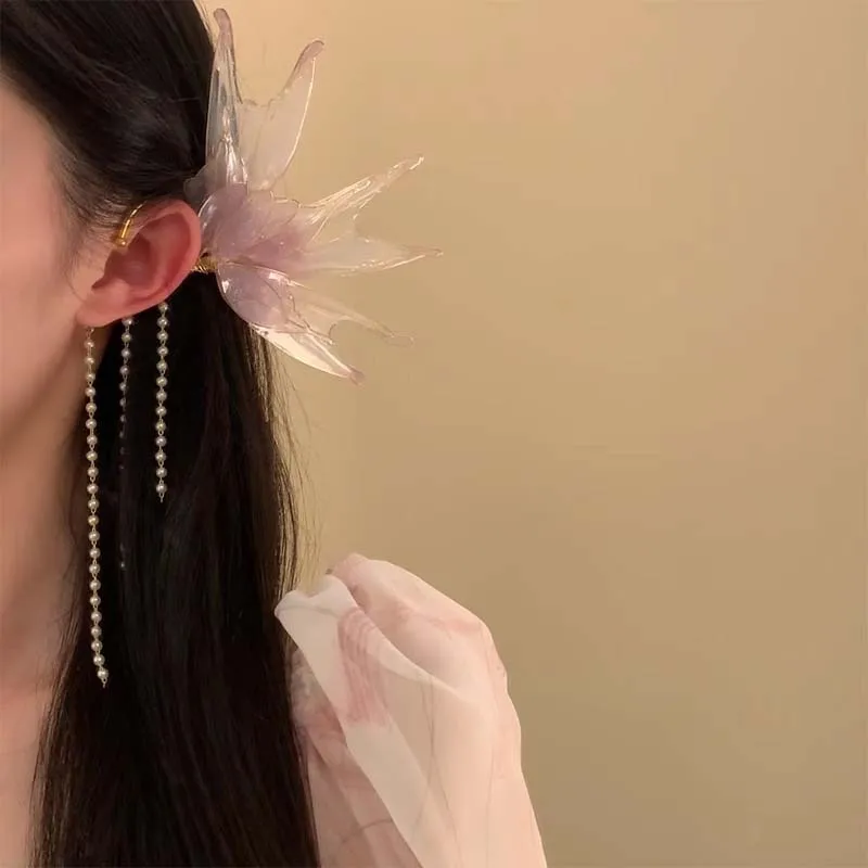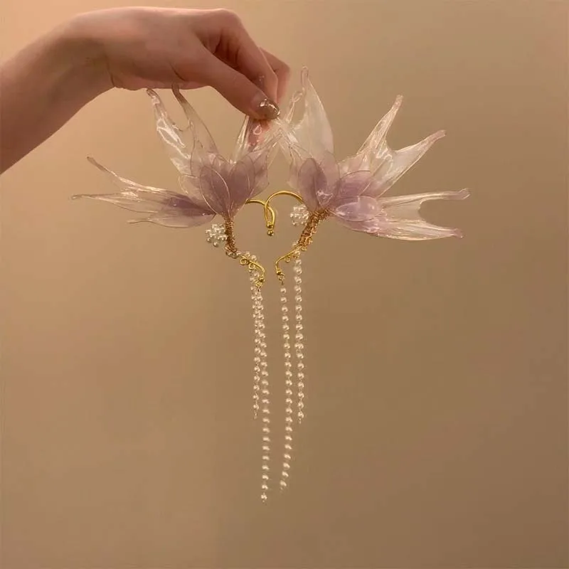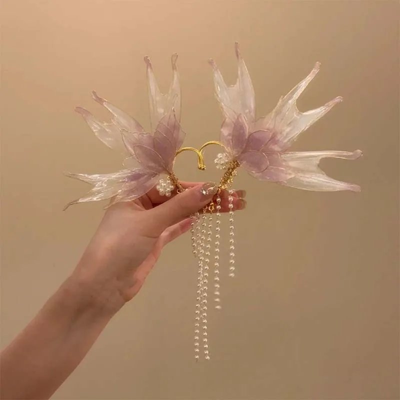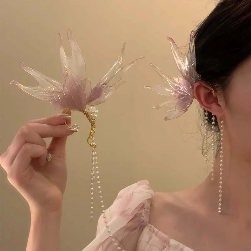Daiiibabyyy Exquisite Pearl Butterfly Tassel Ear Hook for Women Sweet Metal Irregular Wing Ear Clip Earrings Wedding Jewelry Accessories