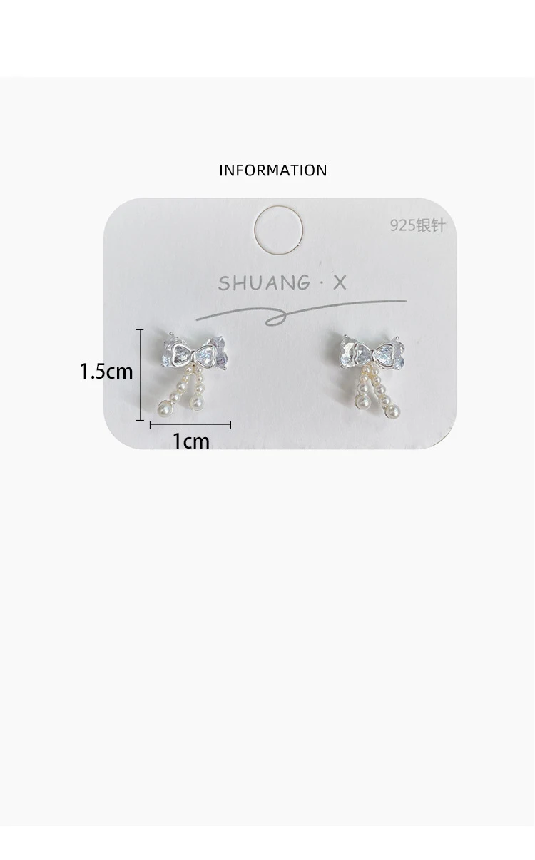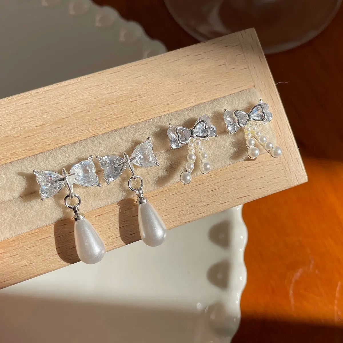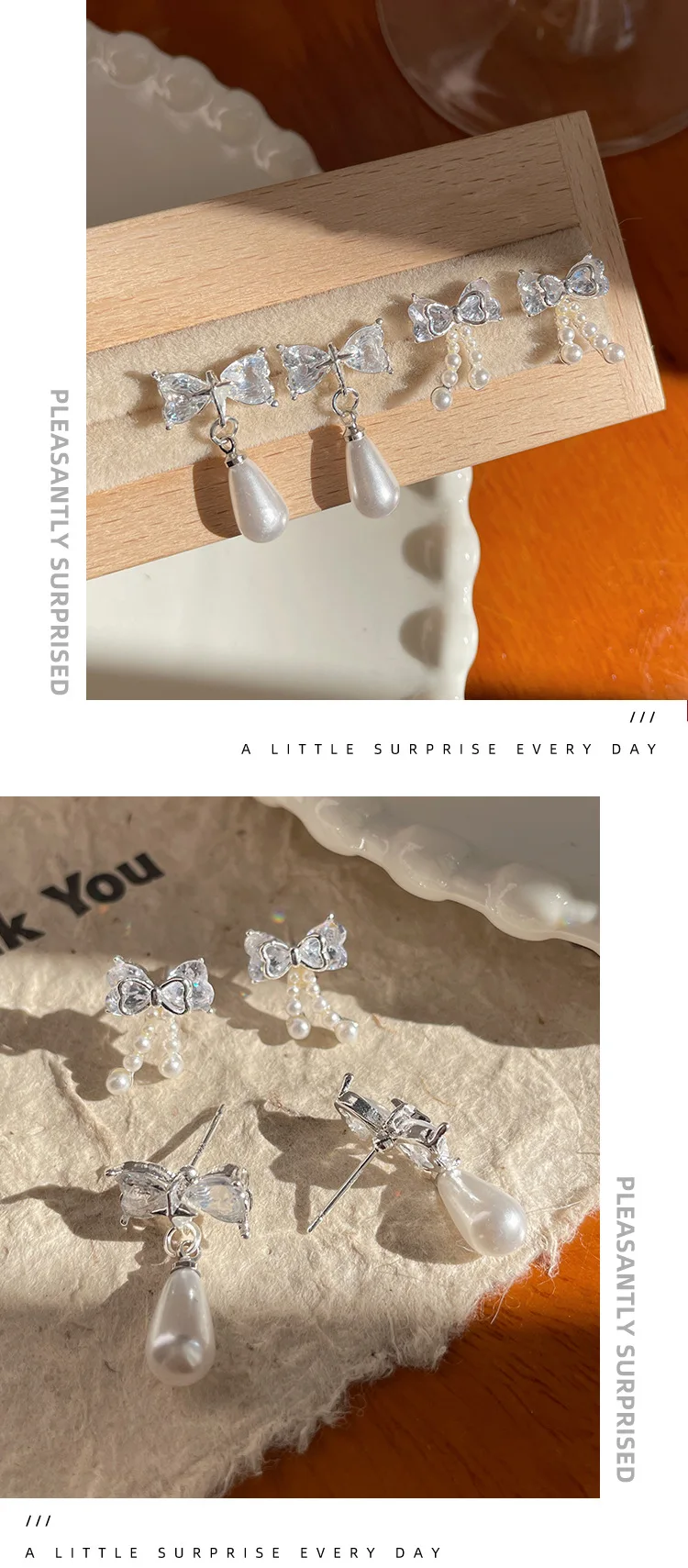 DAIIIBABYYY - Girls White Zircon Bow-knot Pearl Drop Earrings for Women Korean Fashion Sweet Cute Bow Stud Earring Luxury Jewelry Gift