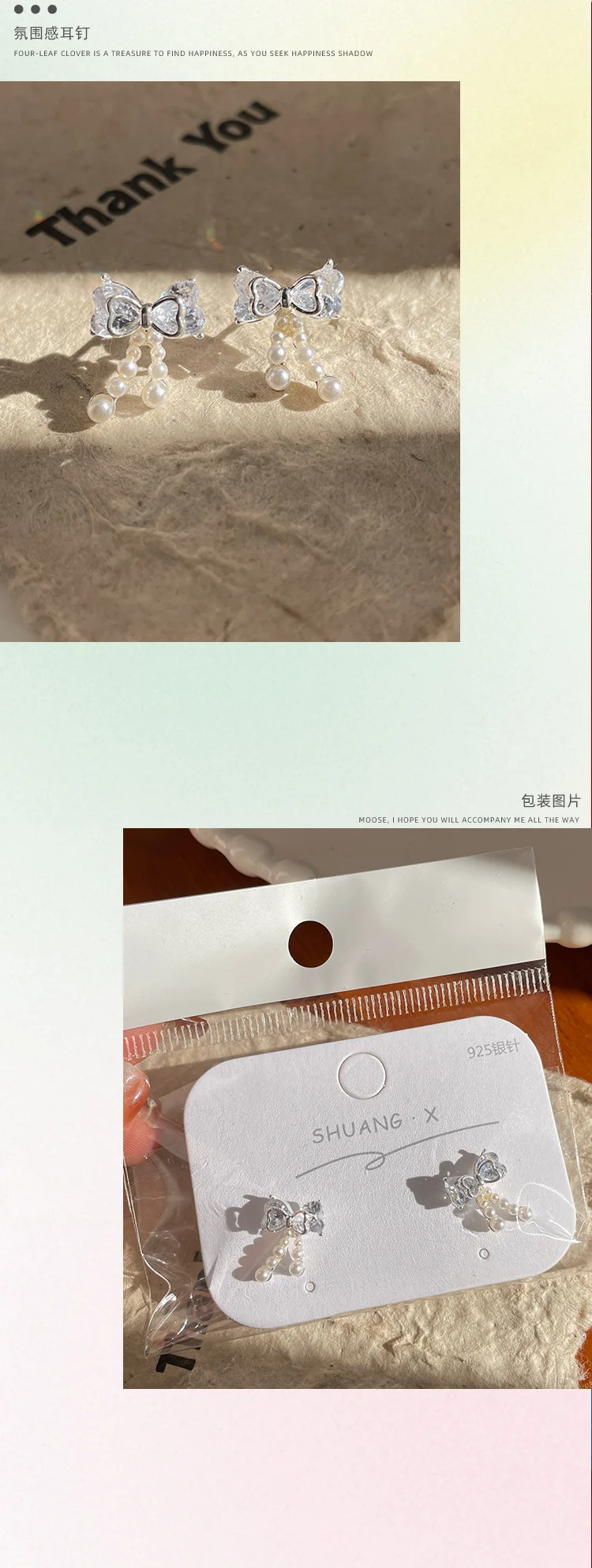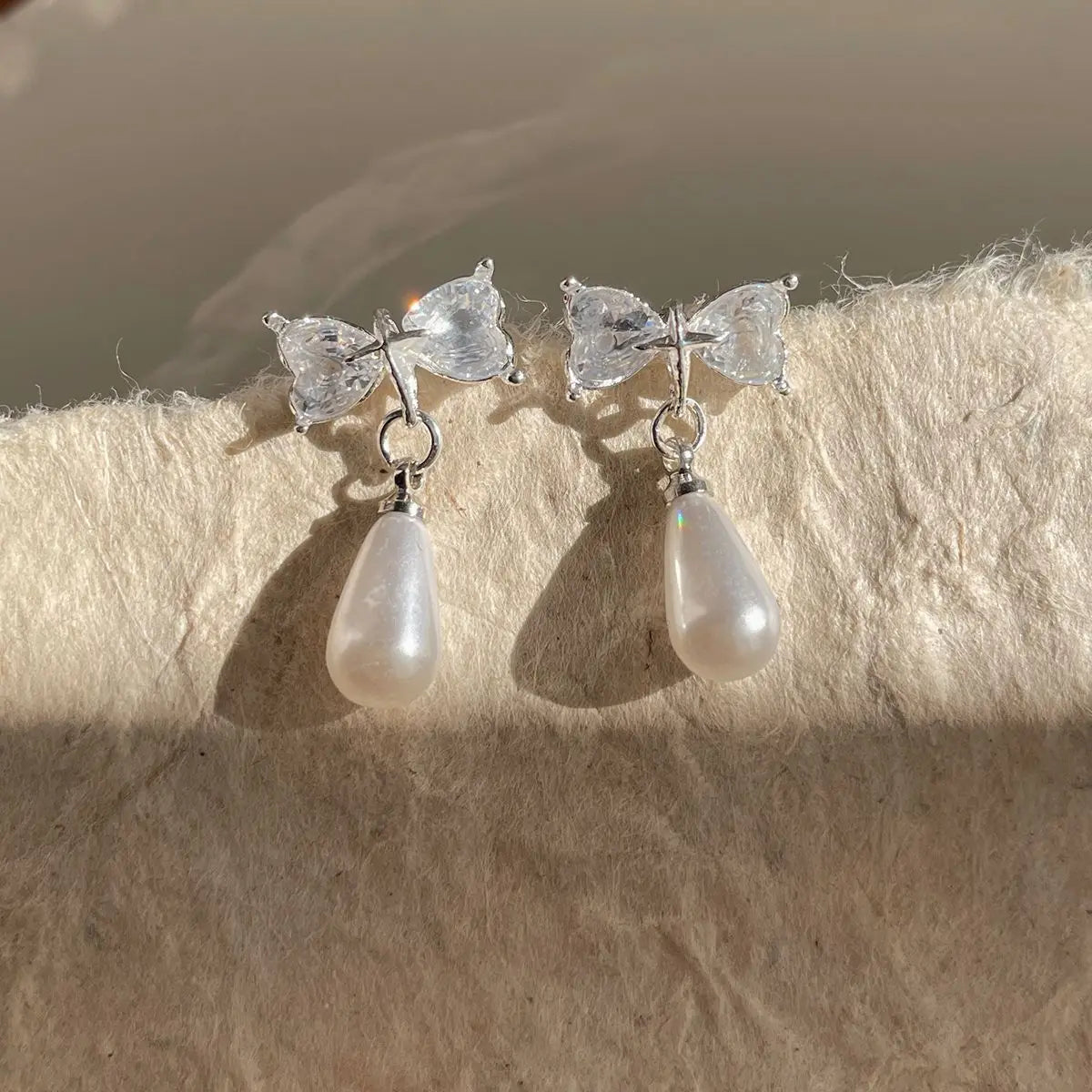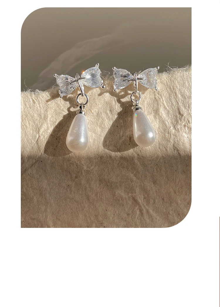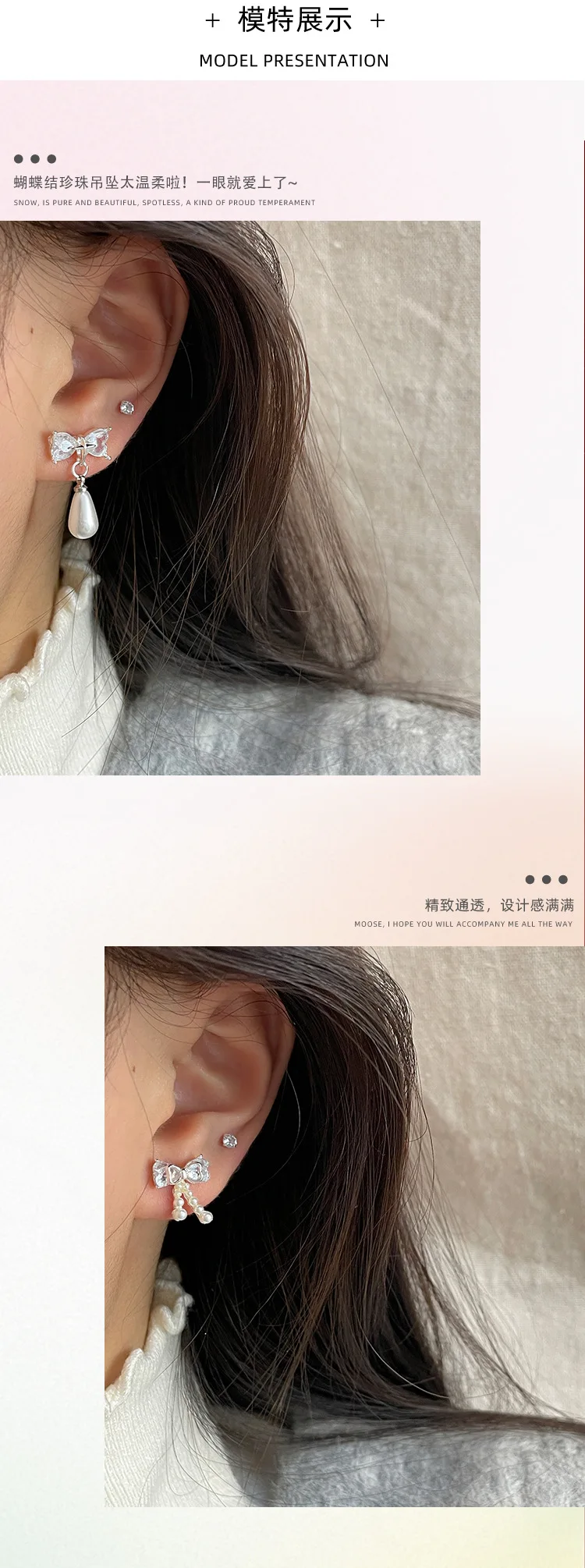 DAIIIBABYYY - Girls White Zircon Bow-knot Pearl Drop Earrings for Women Korean Fashion Sweet Cute Bow Stud Earring Luxury Jewelry Gift