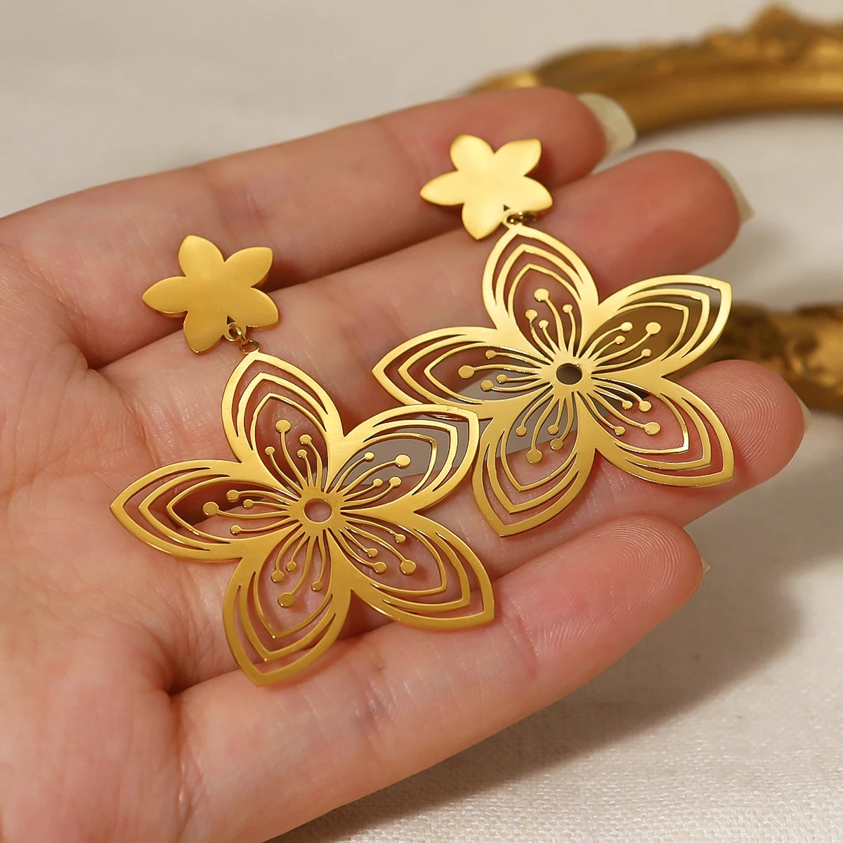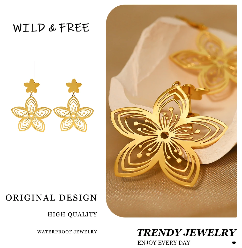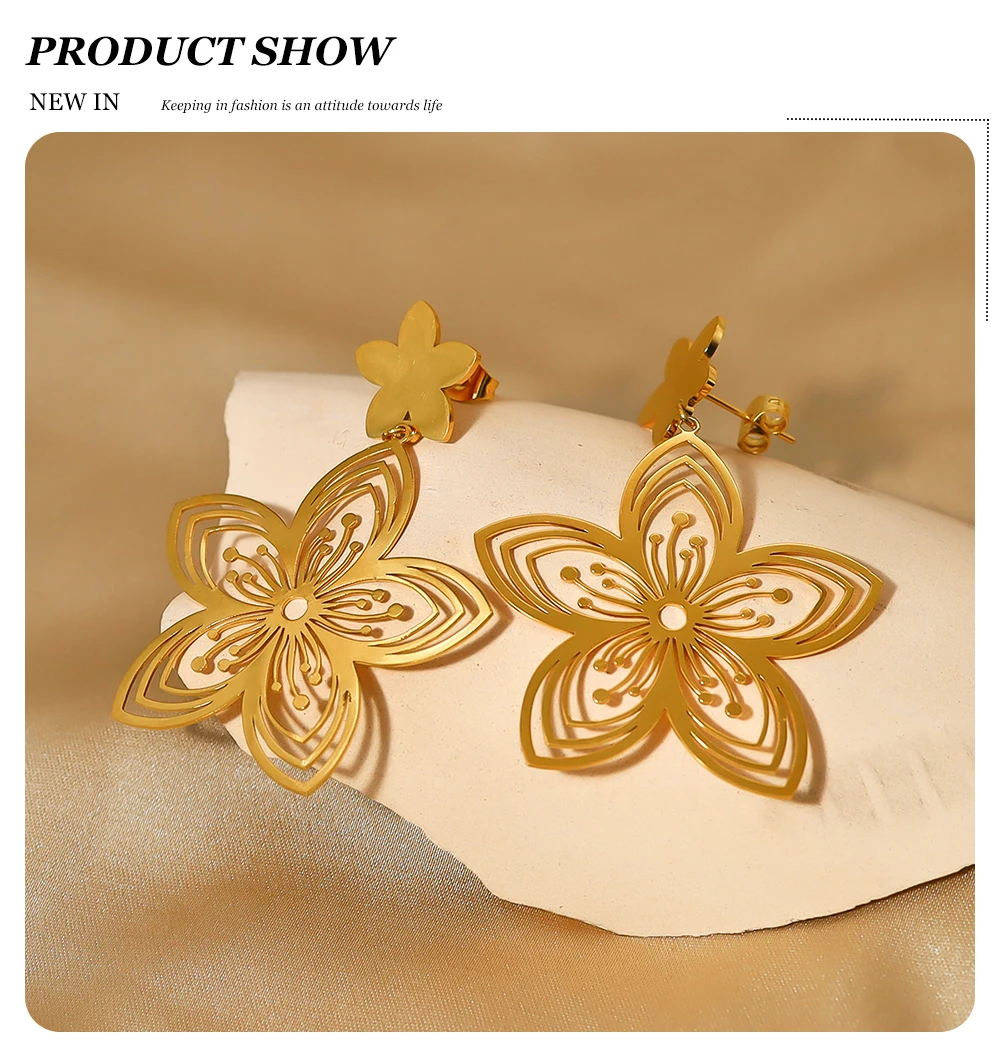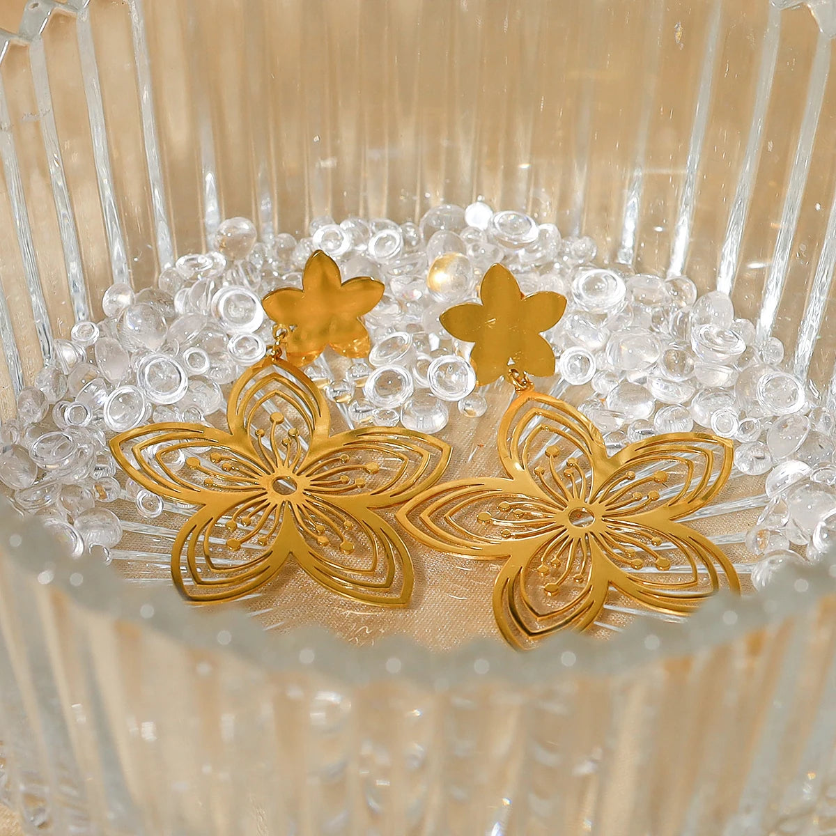 Daiiibabyyy Gold Plated Stainless Steel Hollow Flower Drop Earrings for Women Glossy Dangle Earring Trendy Jewelry