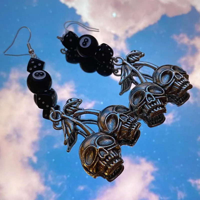 handmade skull lucky cherry cherries grunge earrings eight balls black dice