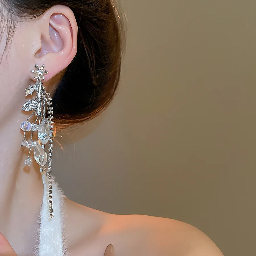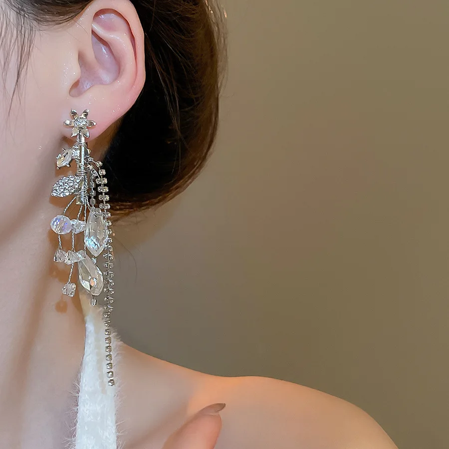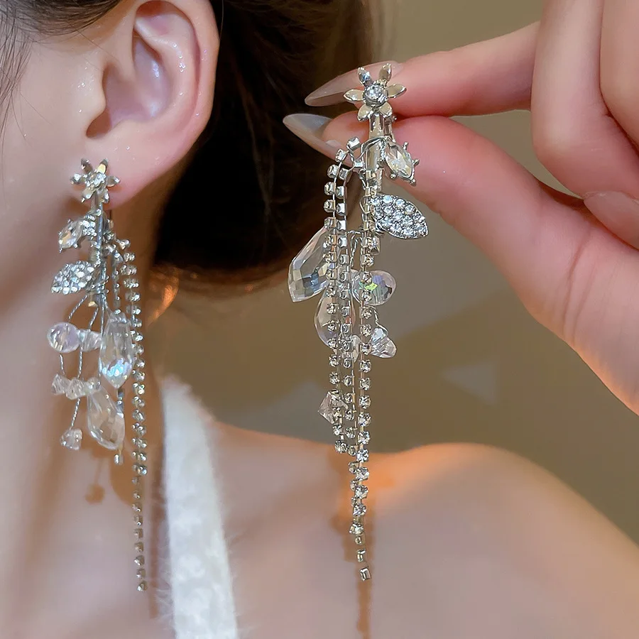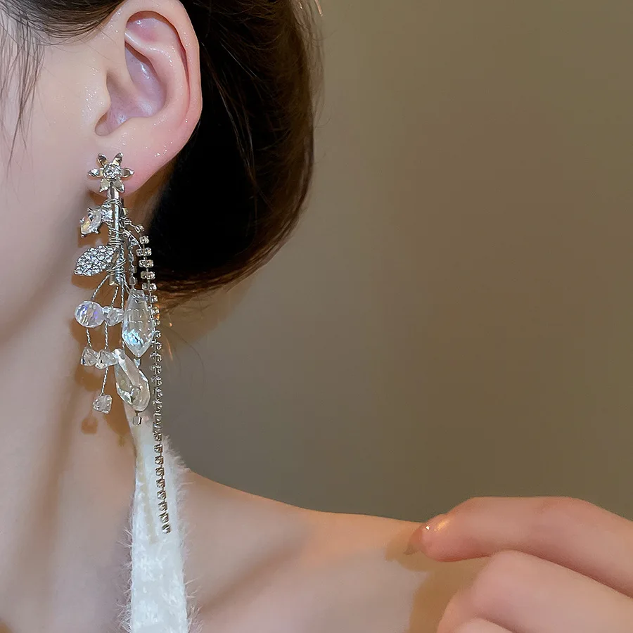 Daiiibabyyy Inlaid Rhinestone Crystal Flowers and Leaves Tassel Ear Clips New Exquisite Earrings Light Luxury High-end Earrings for Women