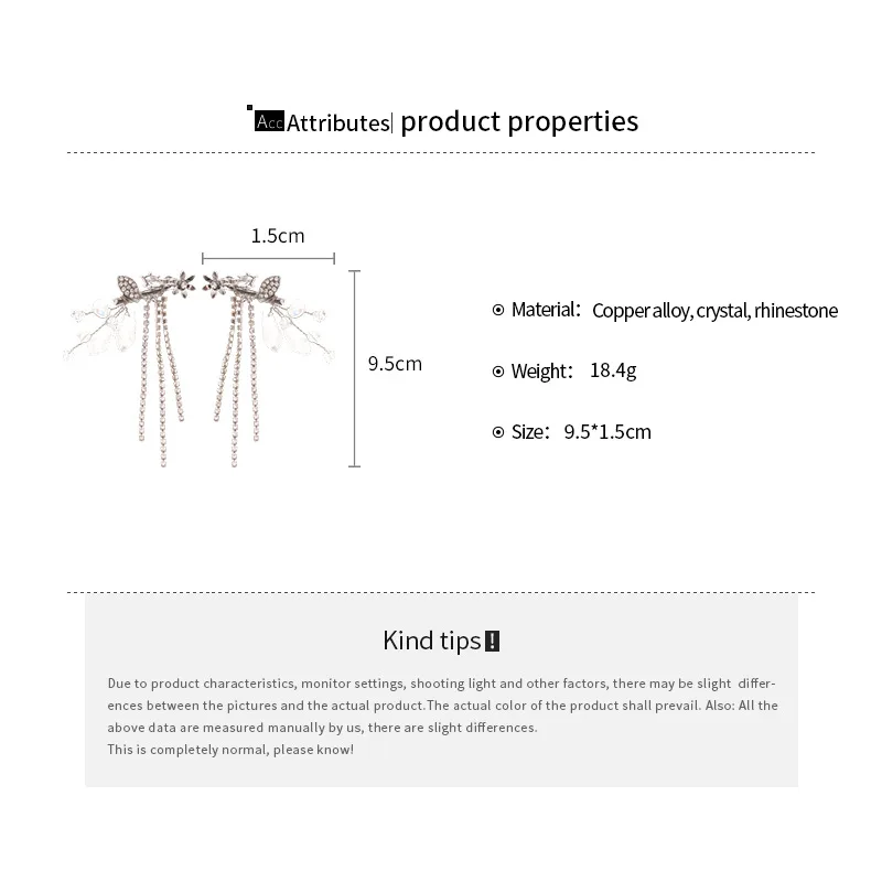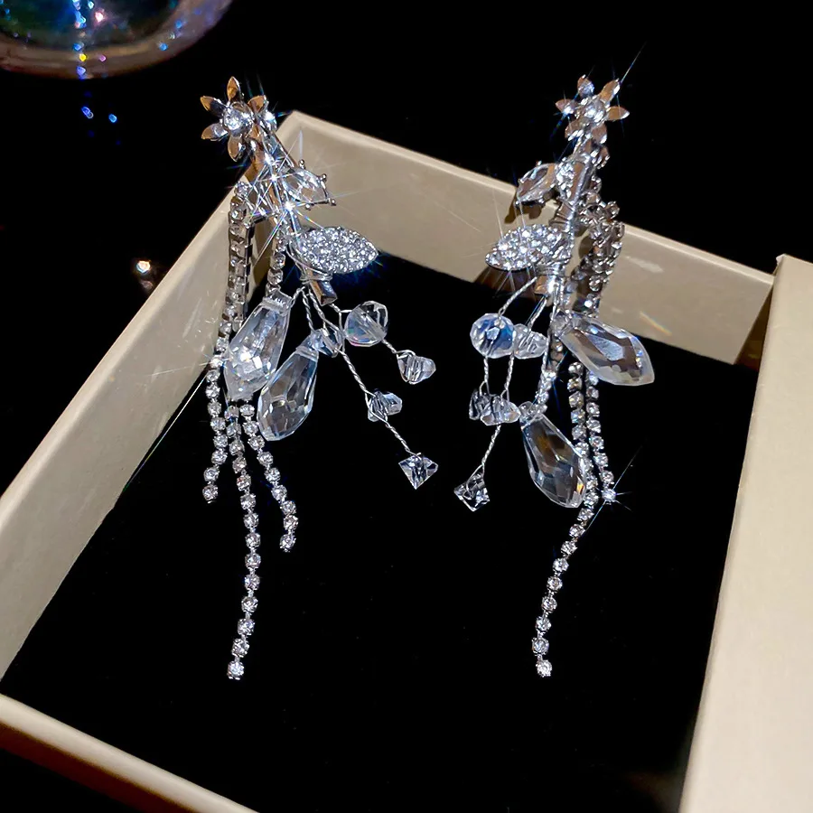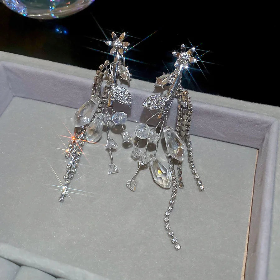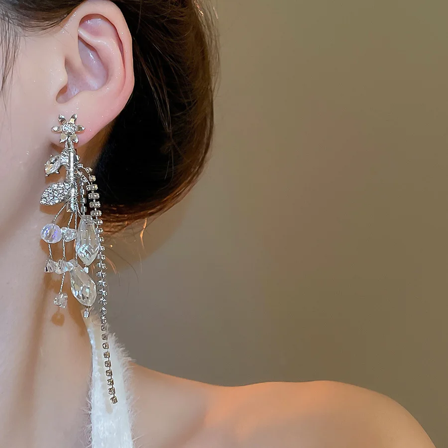 Daiiibabyyy Inlaid Rhinestone Crystal Flowers and Leaves Tassel Ear Clips New Exquisite Earrings Light Luxury High-end Earrings for Women