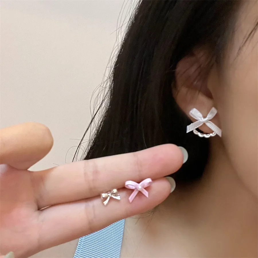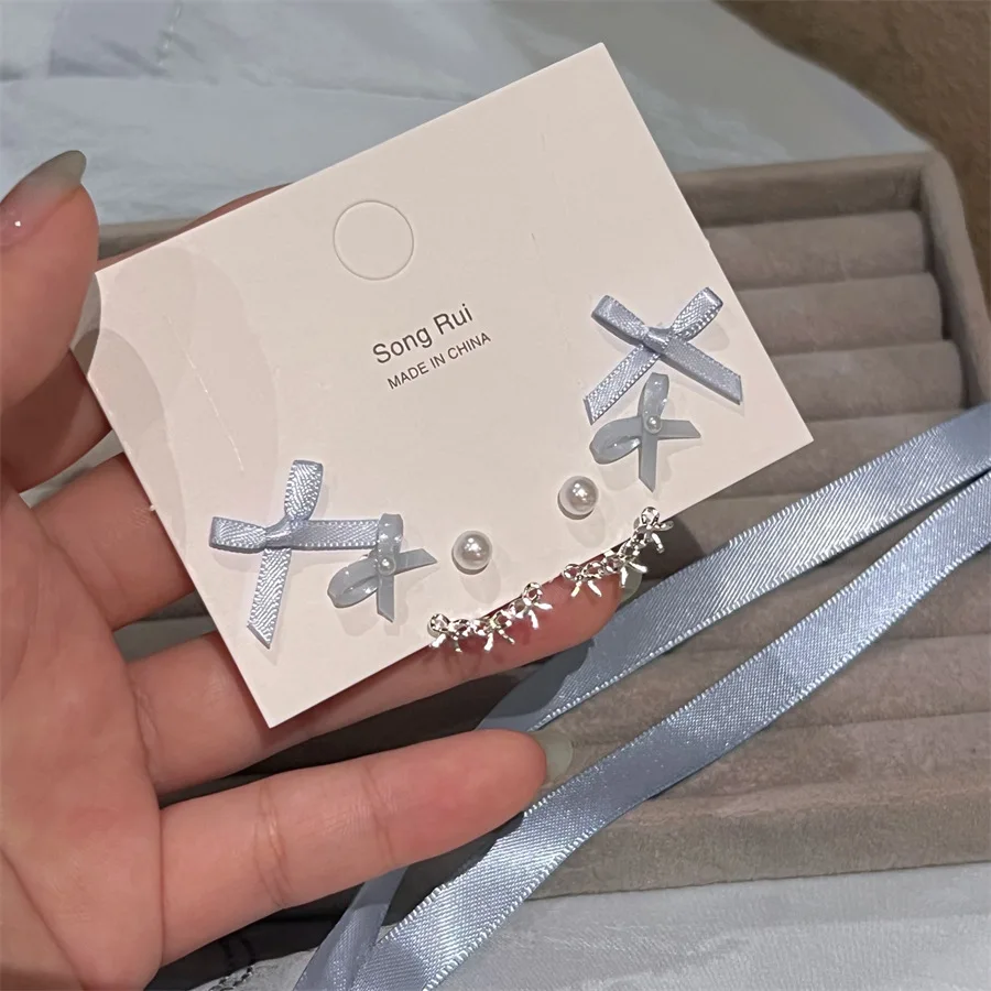 DAIIIBABYYY - Korean Fashion Ballet Style Ribbon Bow-knot Shape Pearl Stud Earrings Set for Women Kpop Pink Blue Charm Earring Jewelry