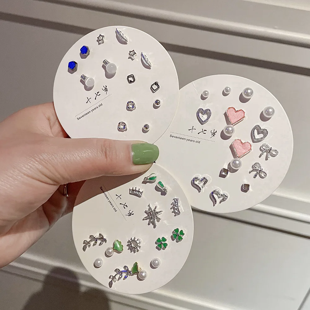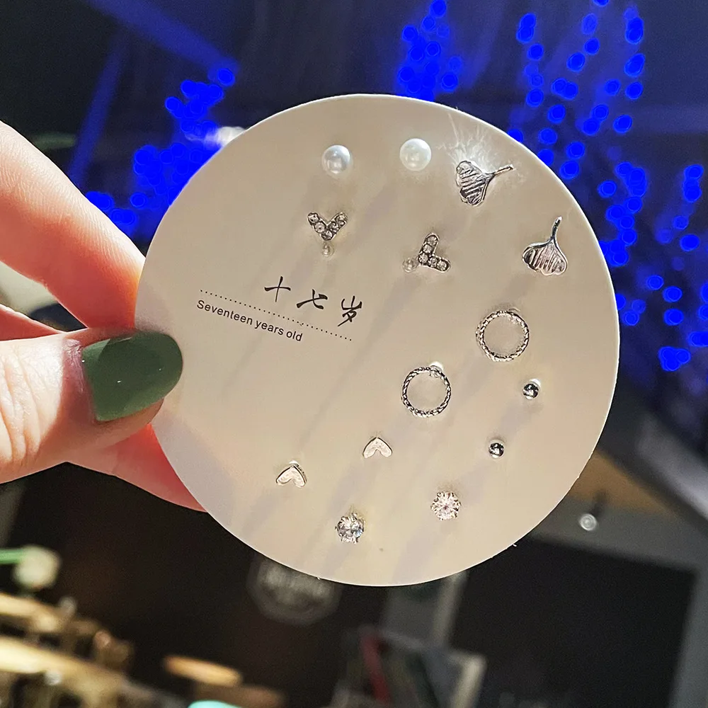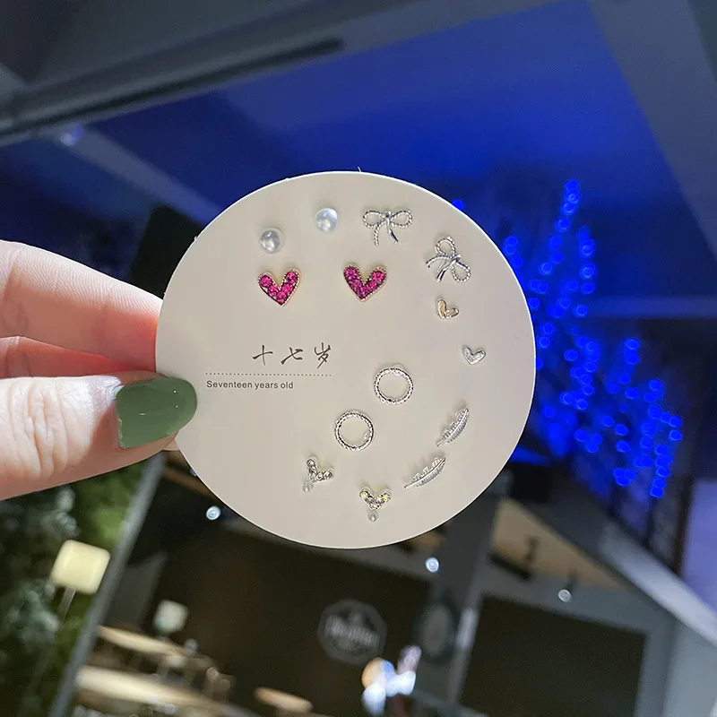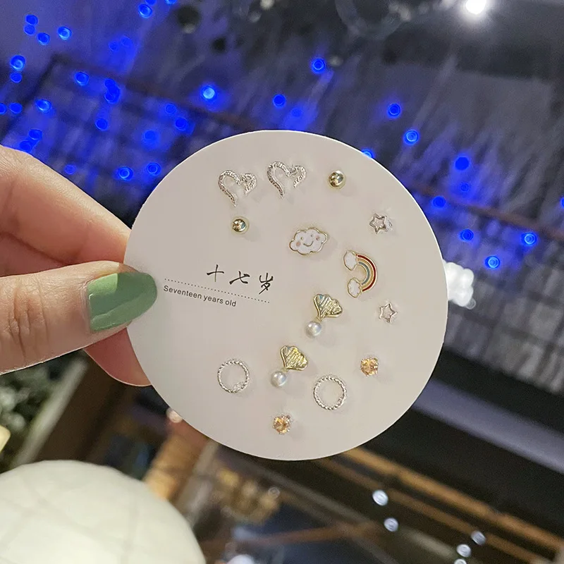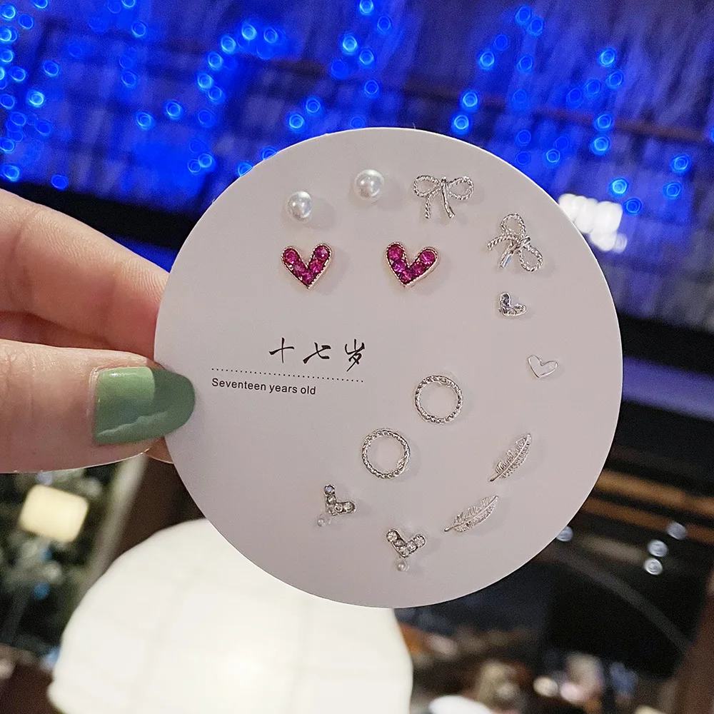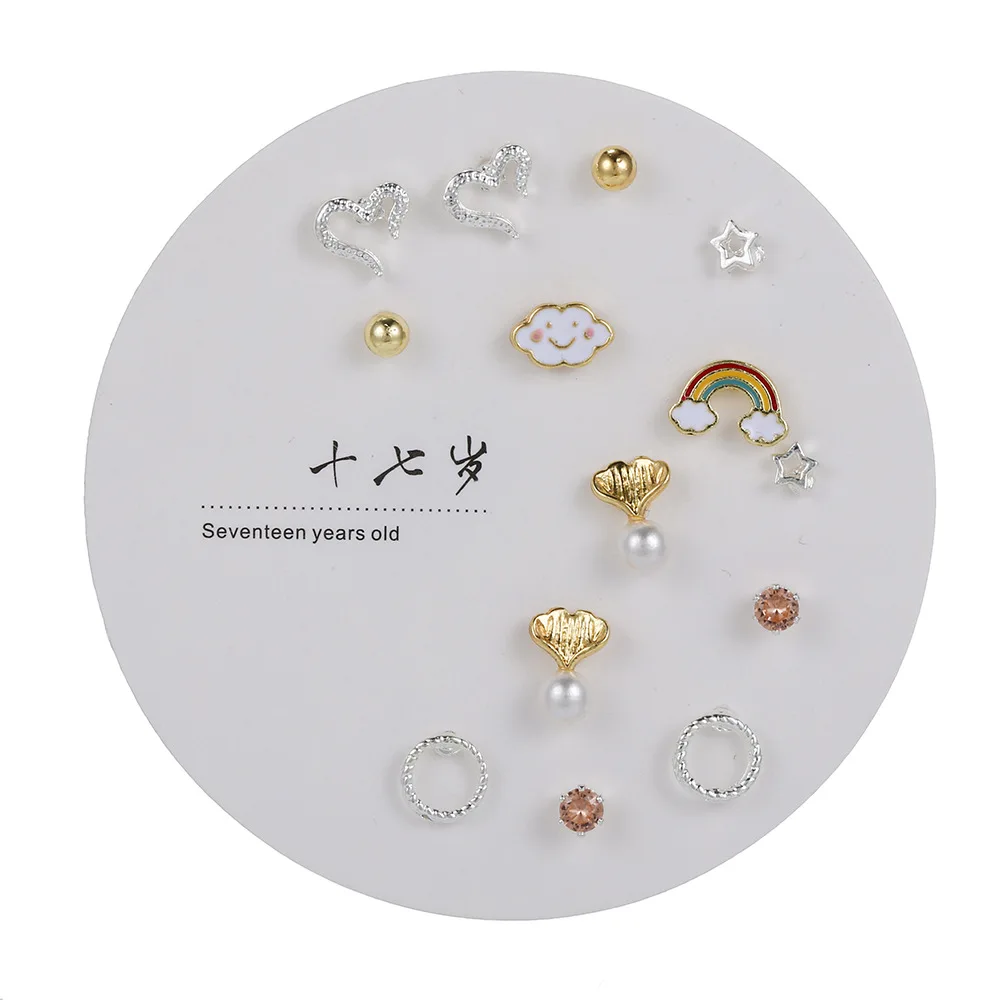 DAIIIBABYYY - Korean Fashion New Week Stud Earrings Set for Women Mini Sweet Pearl Heart Bow Rainbow Earring Luxury Jewelry Gift