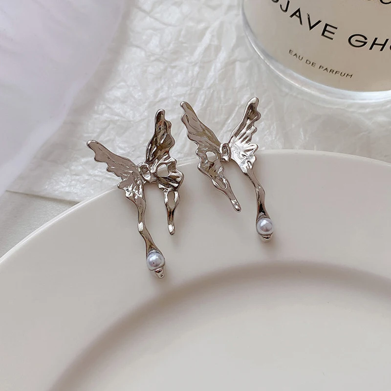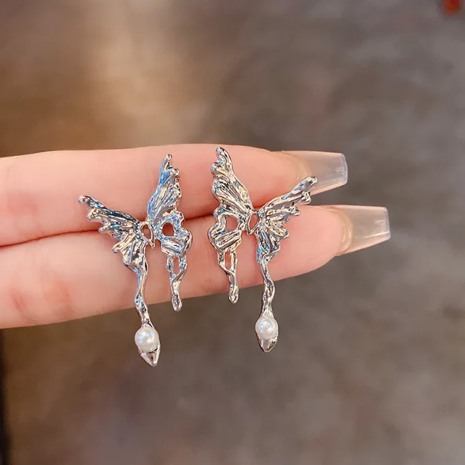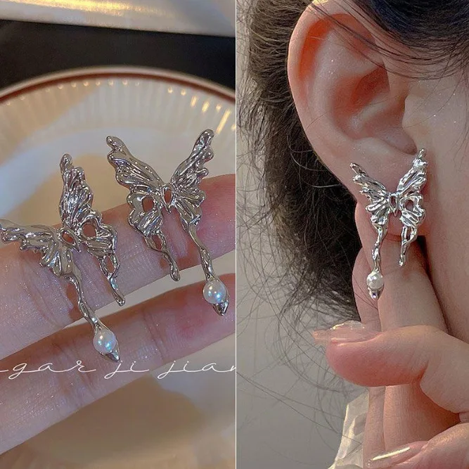DAIIIBABYYY - Kpop Punk Silver Color Asymmetric Butterfly Pearl Stud Earrings Women Korean Fashion INS Cute Heart Geometric Earring