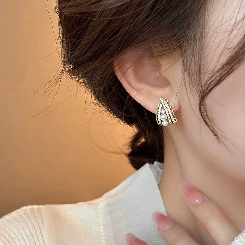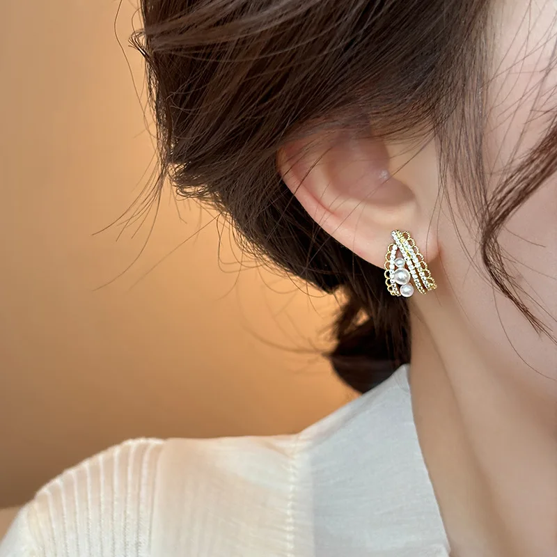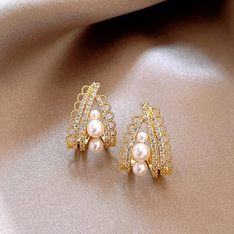 DAIIIBABYYY - New Arrival French Light Luxury Zircon Lace Pearl Stud Earrings Fashion Women Geometric Crystal Jewelry Party Gifts