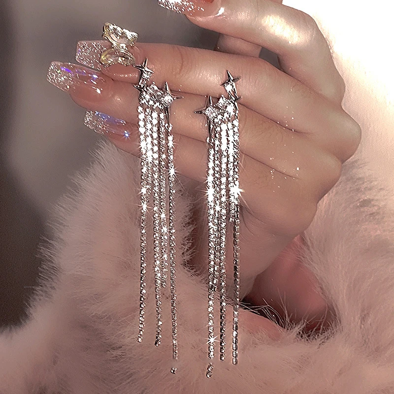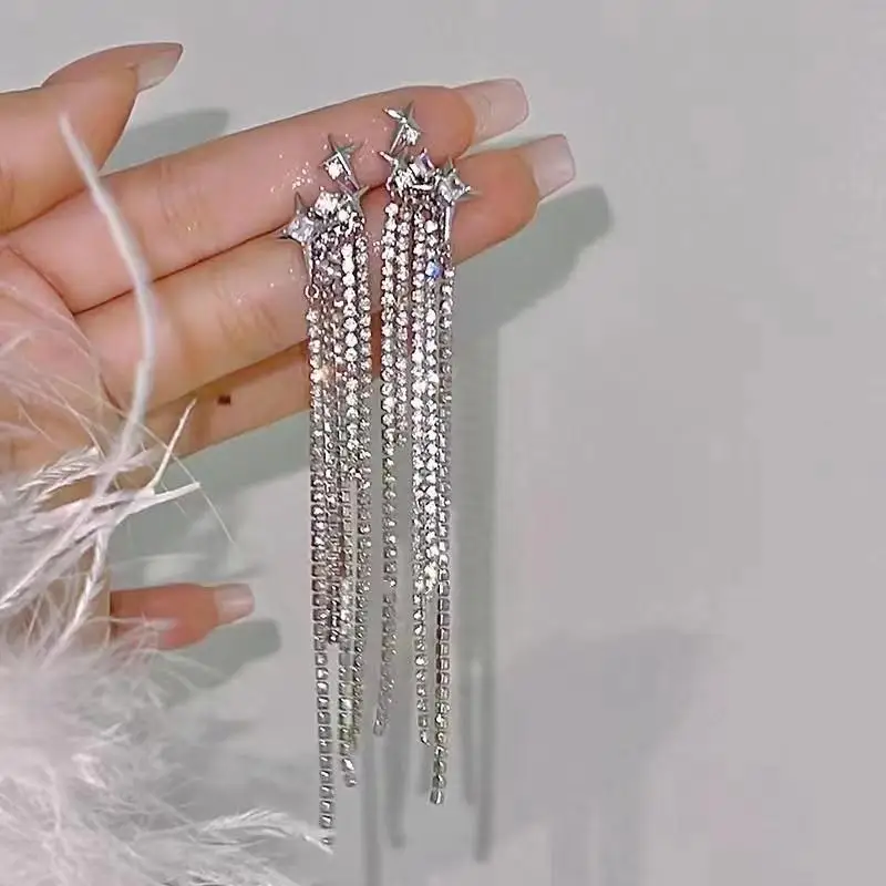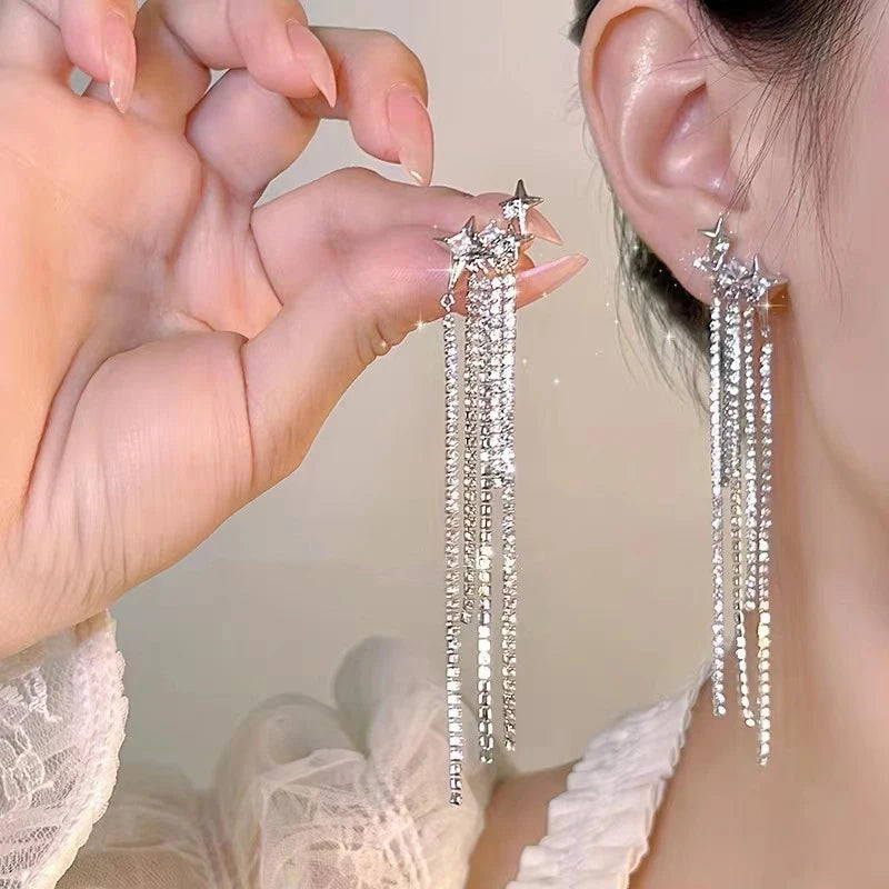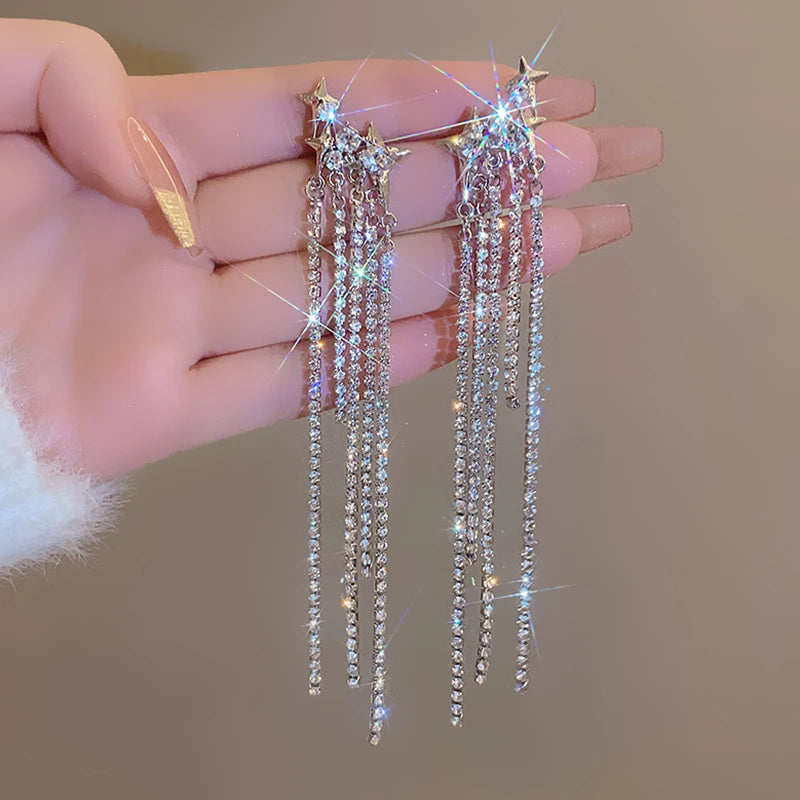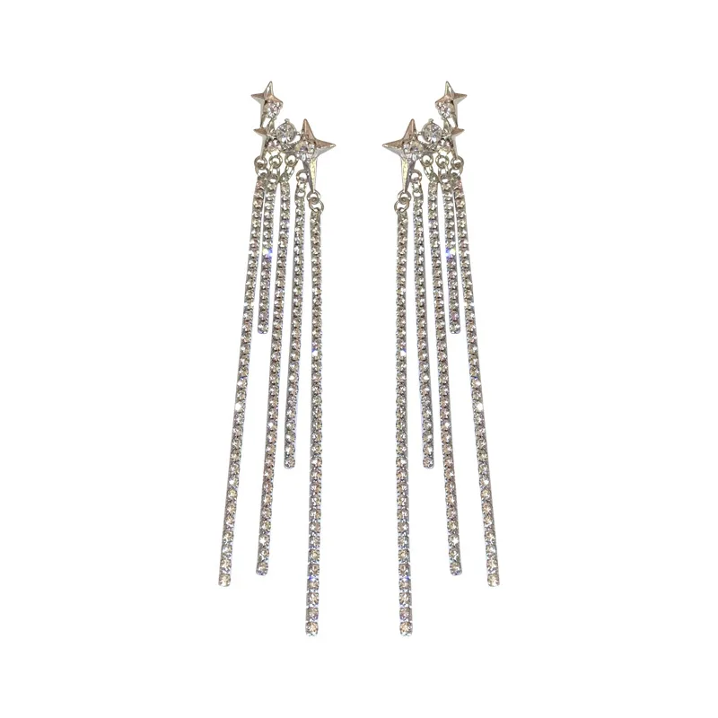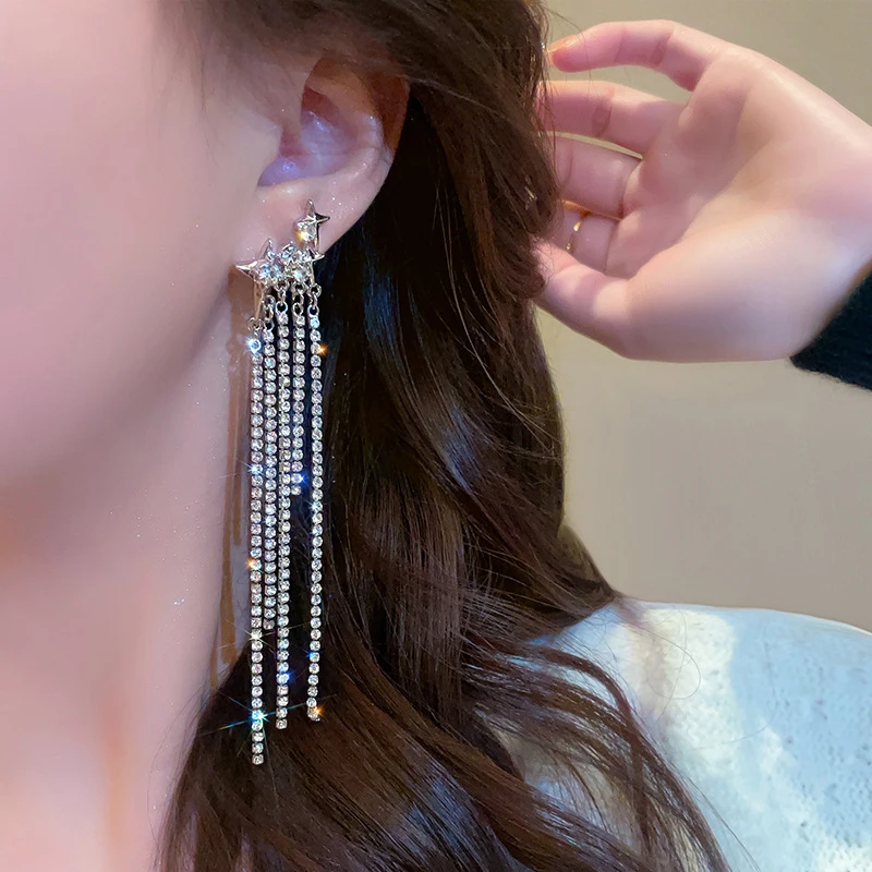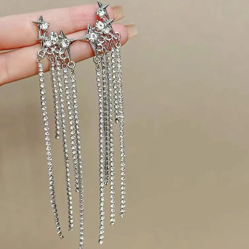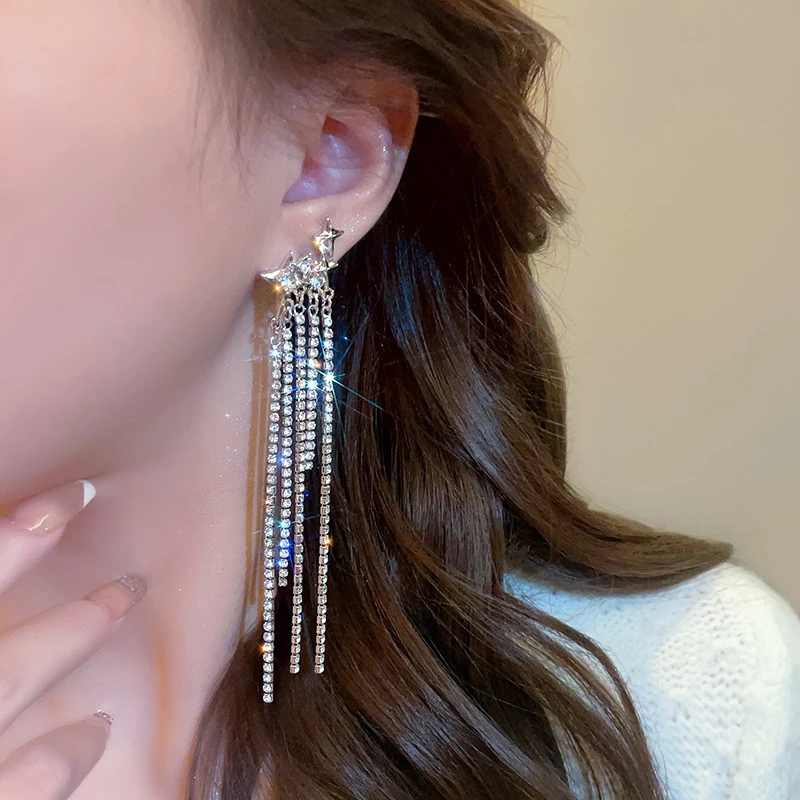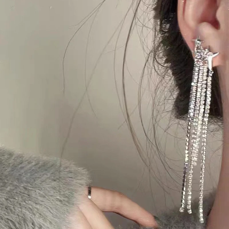 Daiiibabyyy New Rhinestone Tassel Chain Earrings for Women Bling Luxury Zircon Long Drop Earring for Elegent Banquet Jewelry Daily Wear