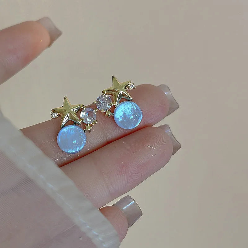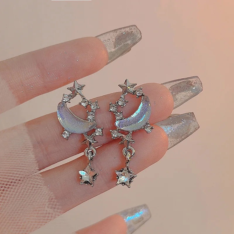 Daiiibabyyy New Sparkling Asymmetric Star Earrings for Women Waterdrop Tassel Chain Moonstone Planet Star Y2K Jewelry Gifts