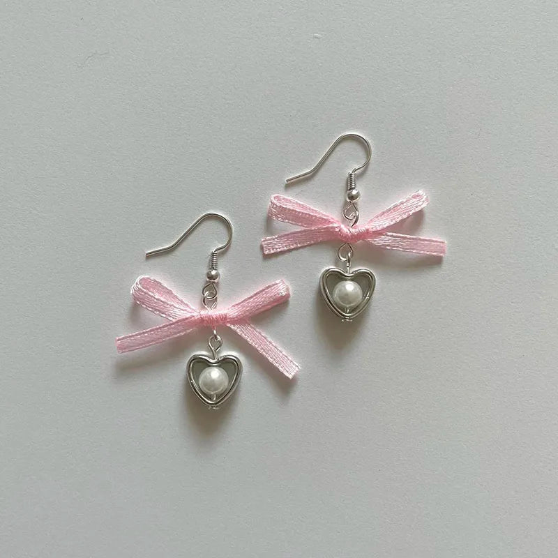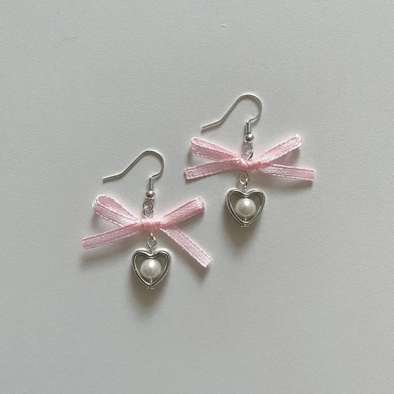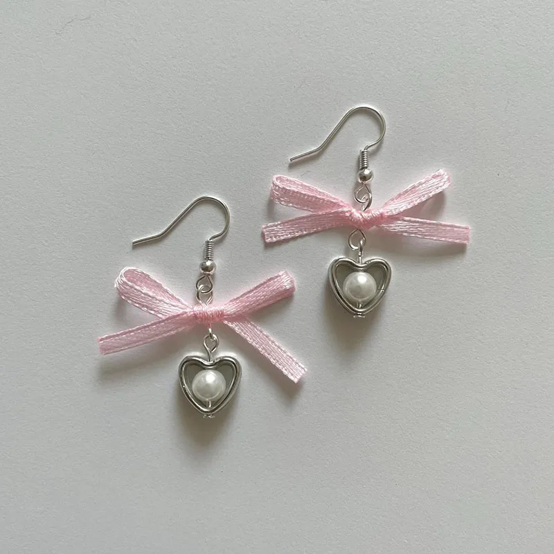 DAIIIBABYYY - Pearl heart charm earrings pink ribbon bows Cute fairy