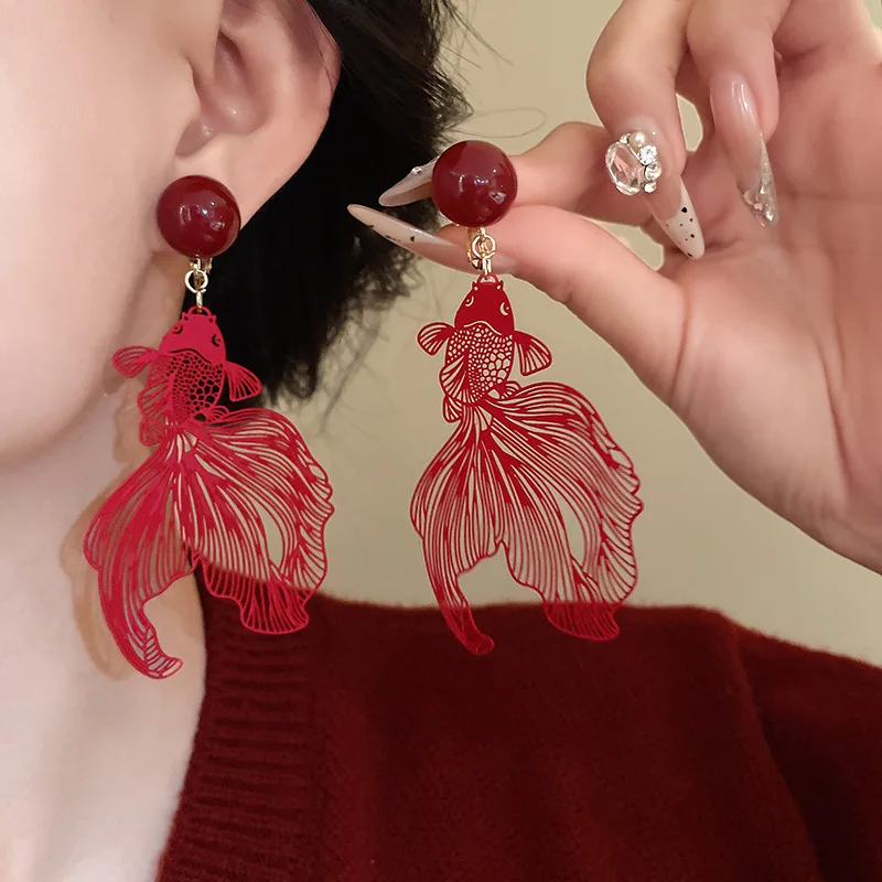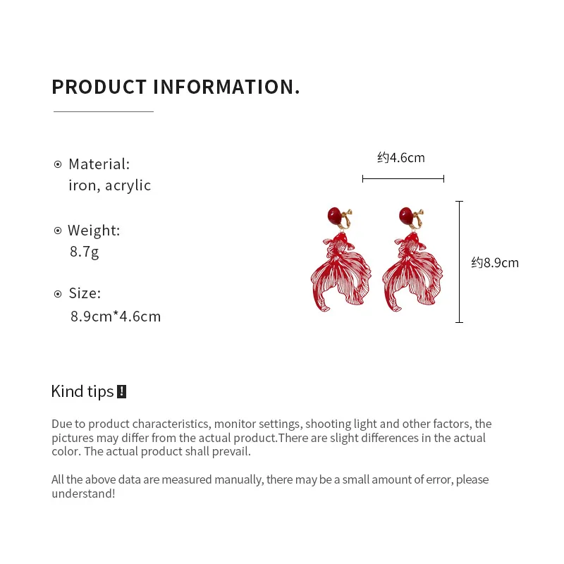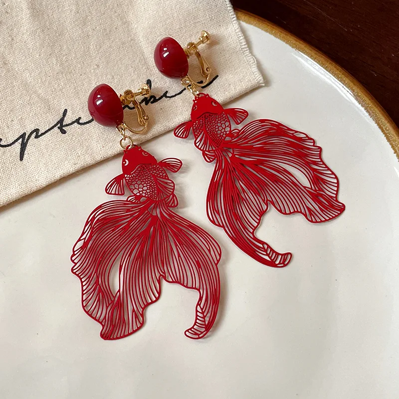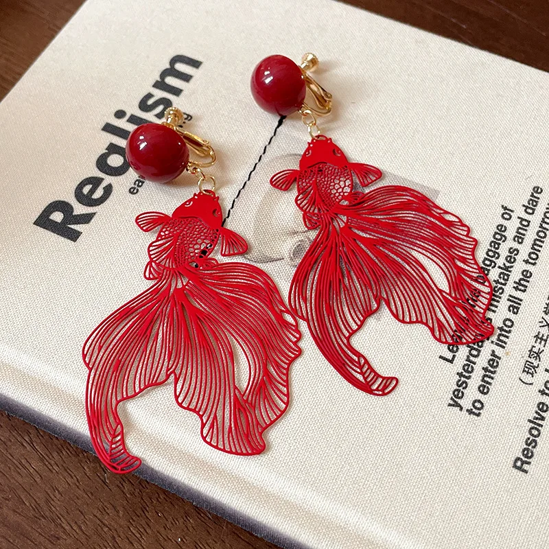 DAIIIBABYYY - Red Koi Fish Clip on Earrings for Women Hollow Metallic Goldfish Ear Clip Earrings with No Piercing Ear Jewelry Lucky Gifts