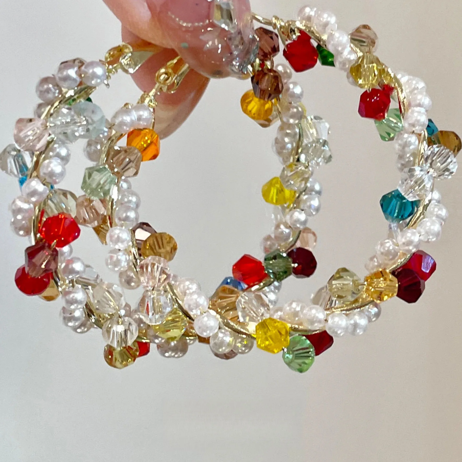 Daiiibabyyy Shiny Colored Rhinestone Hoop Earrings for Women Exaggerated Geometric Crystal Large Circle Earrings Pearl Bead Earrings Jewelry