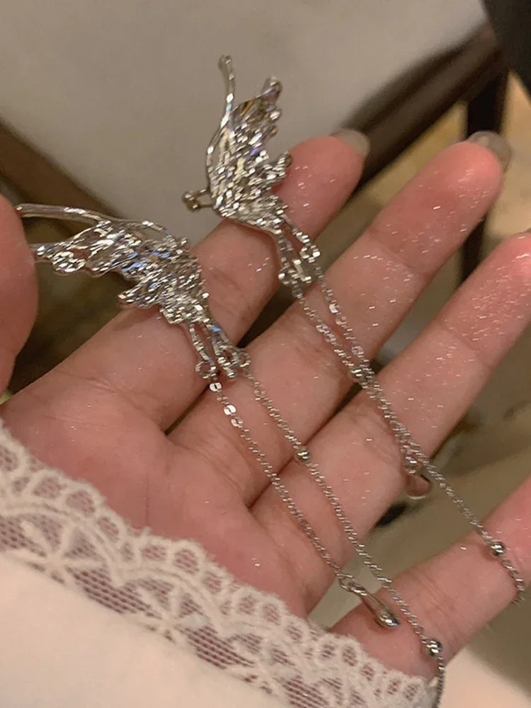 Daiiibabyyy Silver Color Earrings Fairy Angel Wings Butterfly Long Tassel Clip Earrings for Women Teens Cool Ear Cuff Party Jewelry