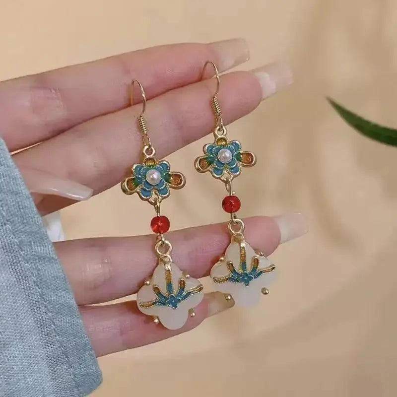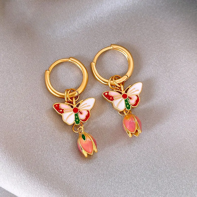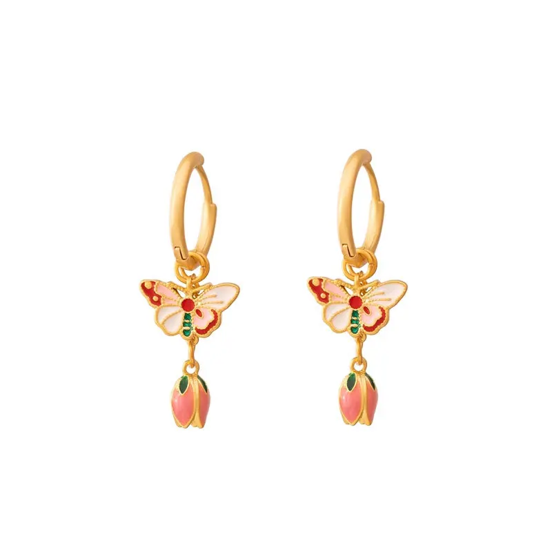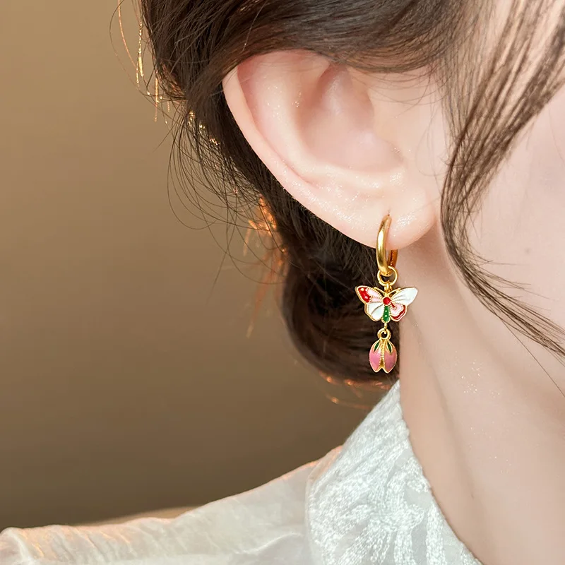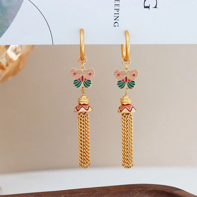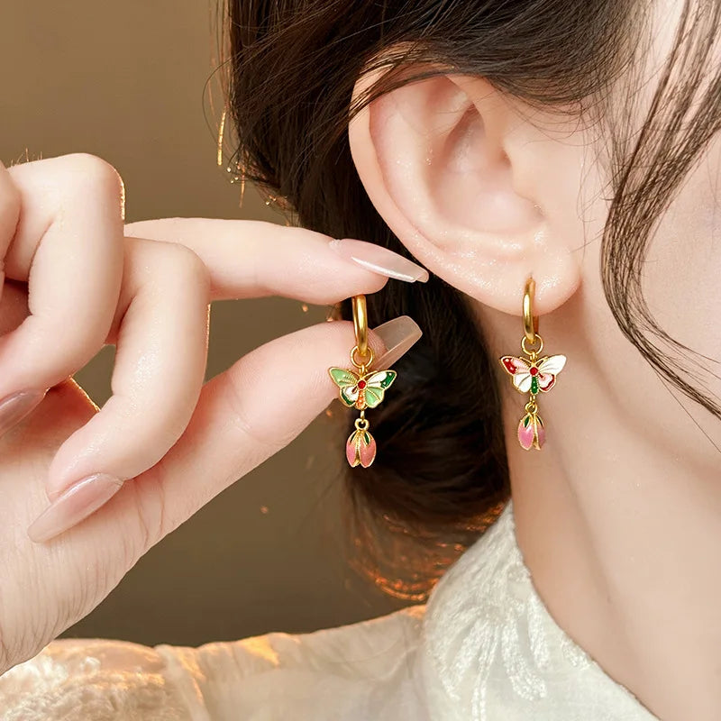 DAIIIBABYYY - Steel Fun Jewelry Retro Colorful Enamel Butterfly Earrings for Women Girl 2024 New Chinese Style Flower Tassel Drop Earring Gift