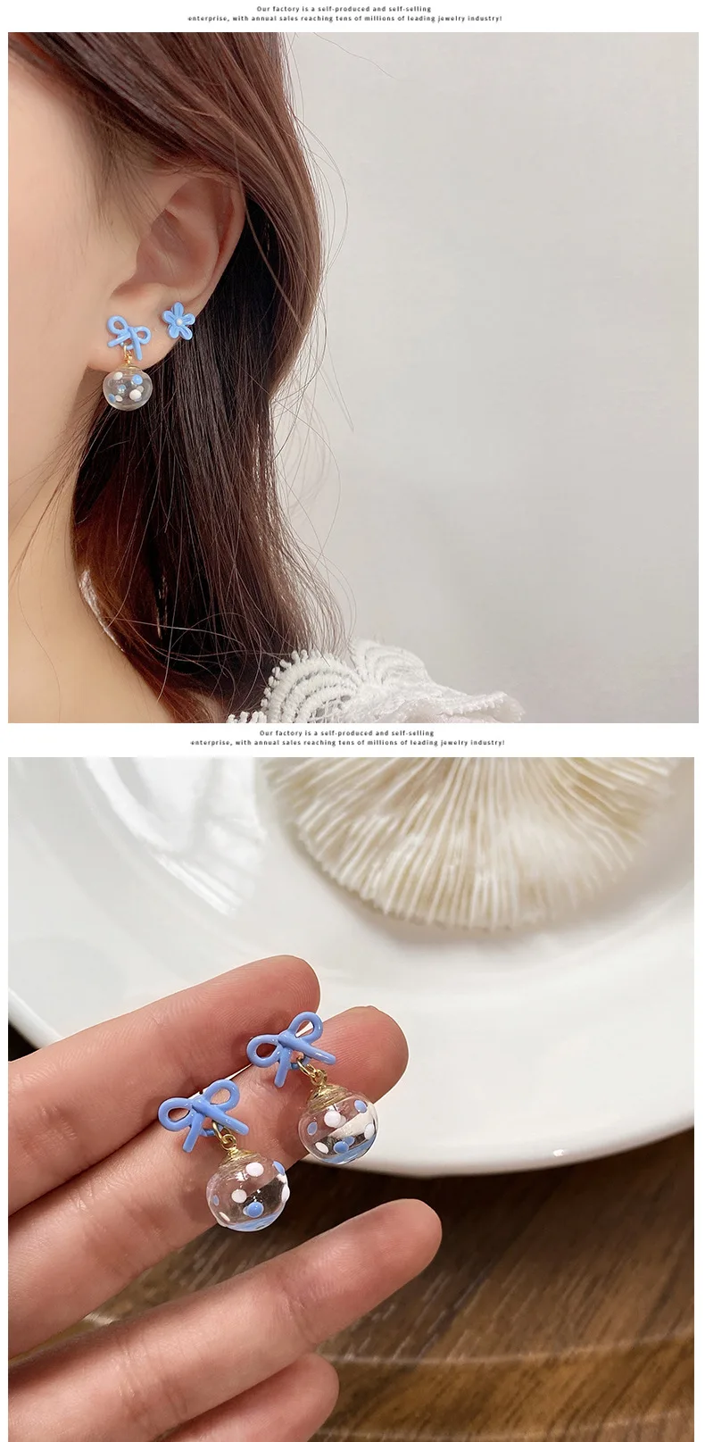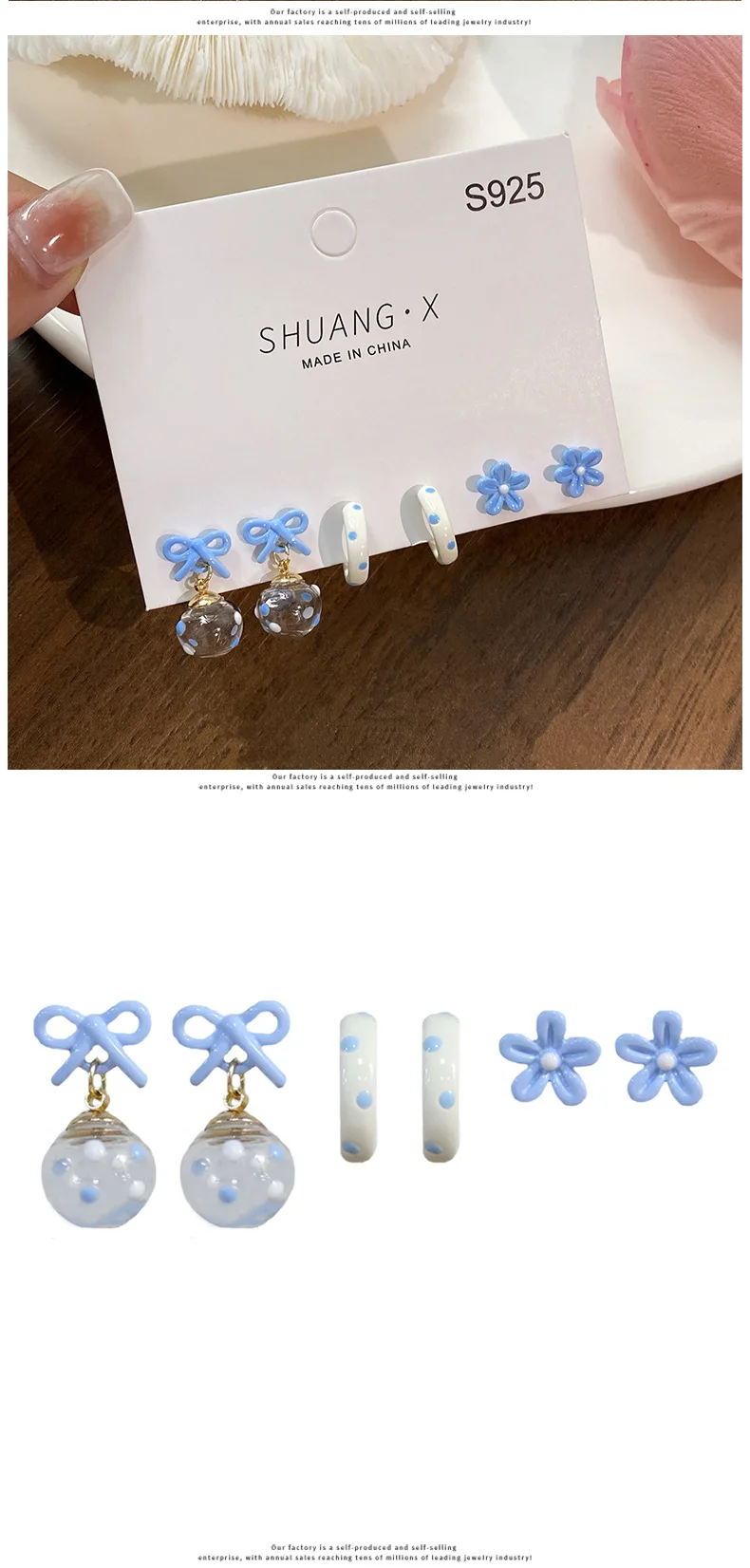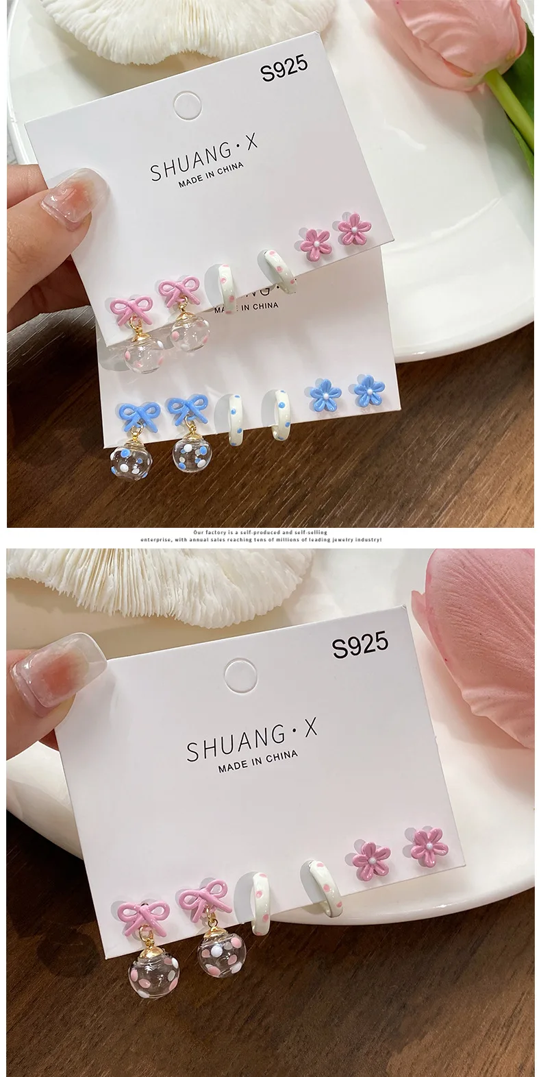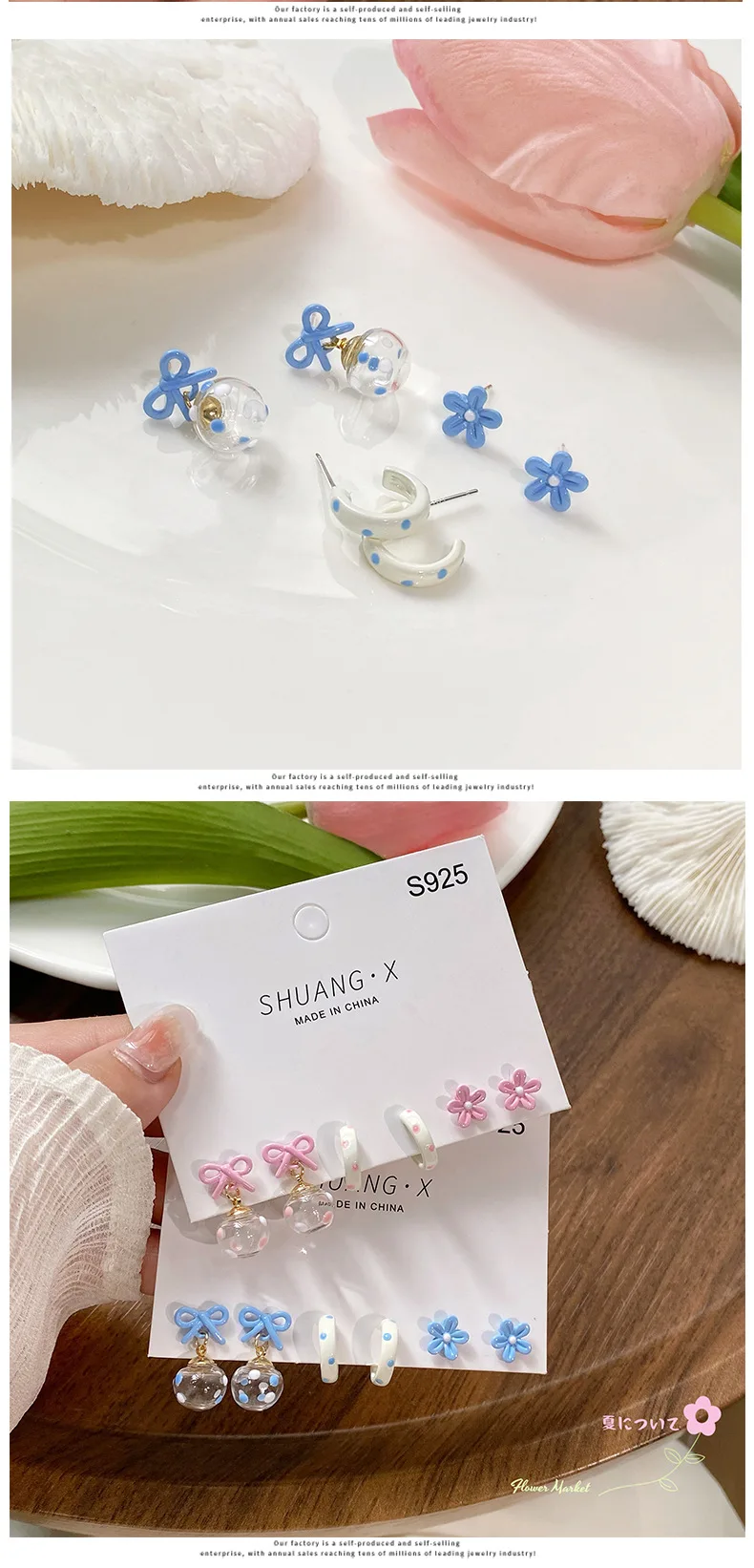 DAIIIBABYYY - Sweet Girls INS Pink Blue Bow-knot Ball Flower Stud Earrings Set for Women Korean Fashion Bow Earring Party Jewelry Gift