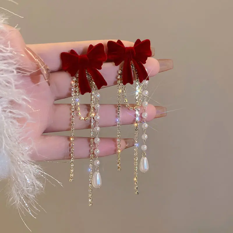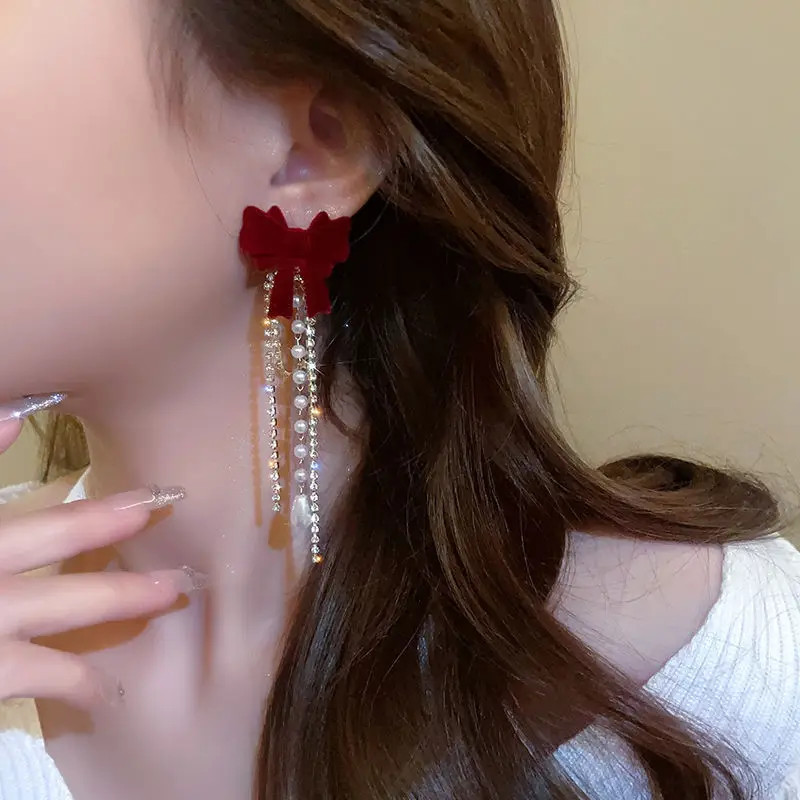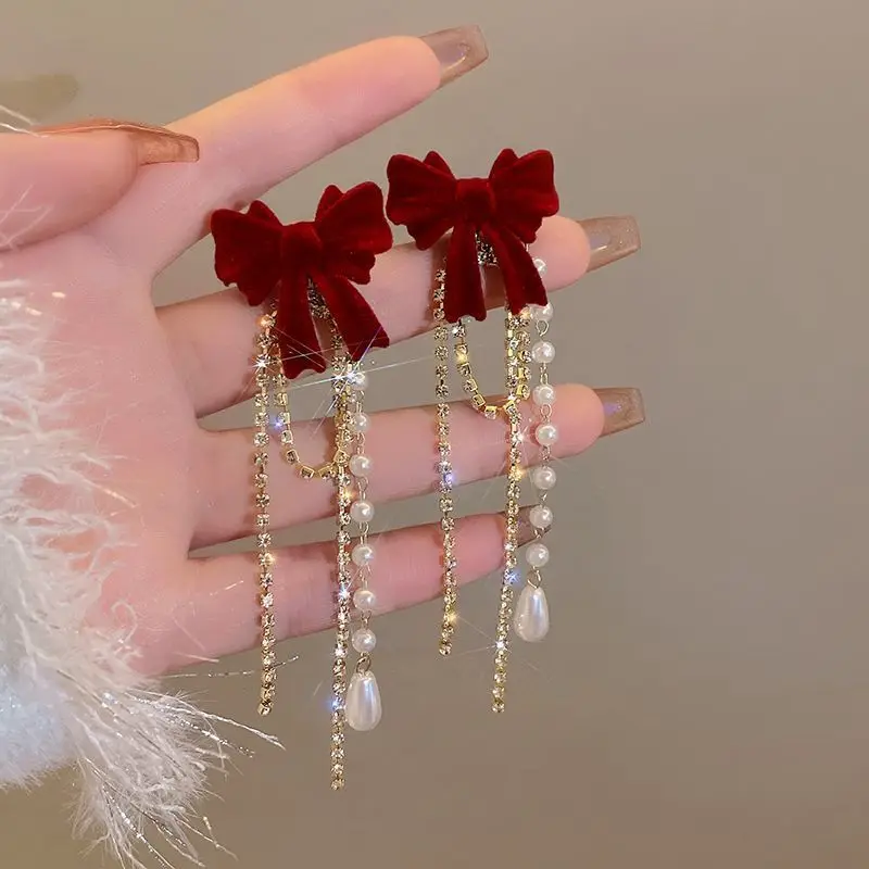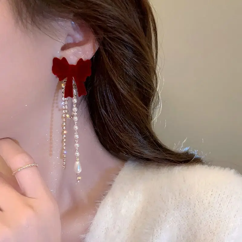 DAIIIBABYYY - Wine Red Flocking Bow-knot Rhinestone Pearl Tassel Drop Earrings for Women Korean Fashion Winter New Year Party Earring Jewelry