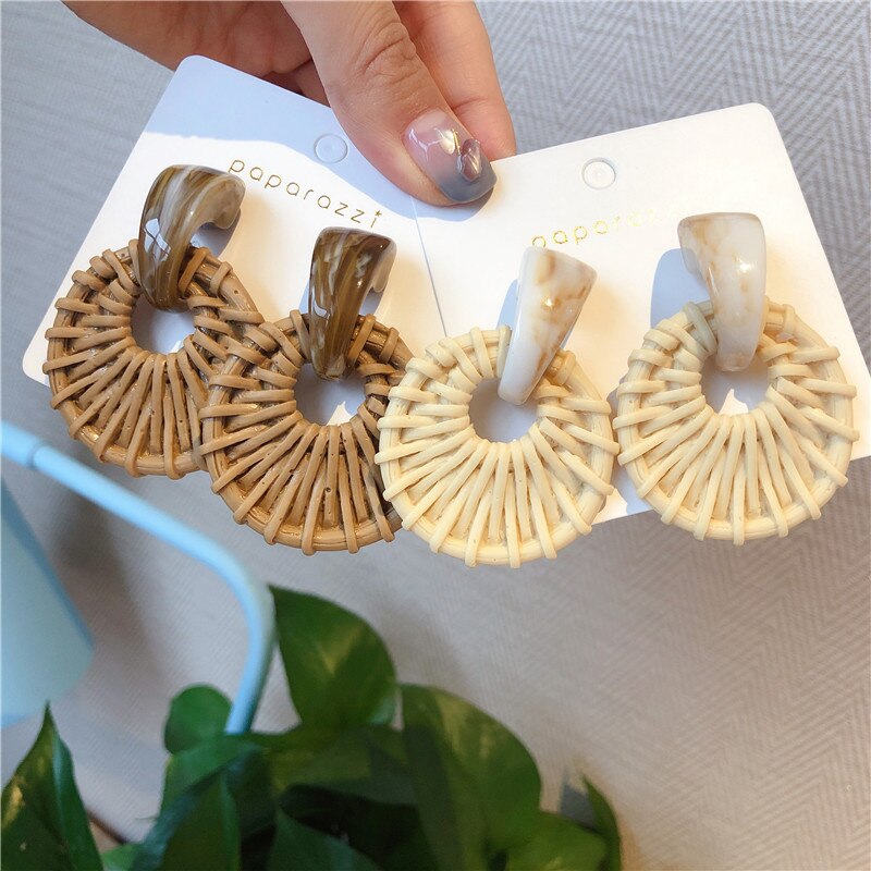 Summer Bohemia Simple Beige Brown Bamboo weave Statement Drop Earrings For Women Fashion Geometric Dangle Earring bijoux brincos