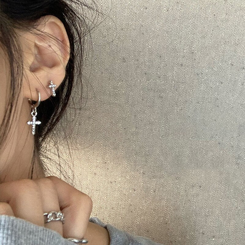 Trendy Punk Silver Color Geometric Crystal Inlay Cross Drop Earrings For Women Fashion Exaggerate Dangle Earring Hip hop Jewelry