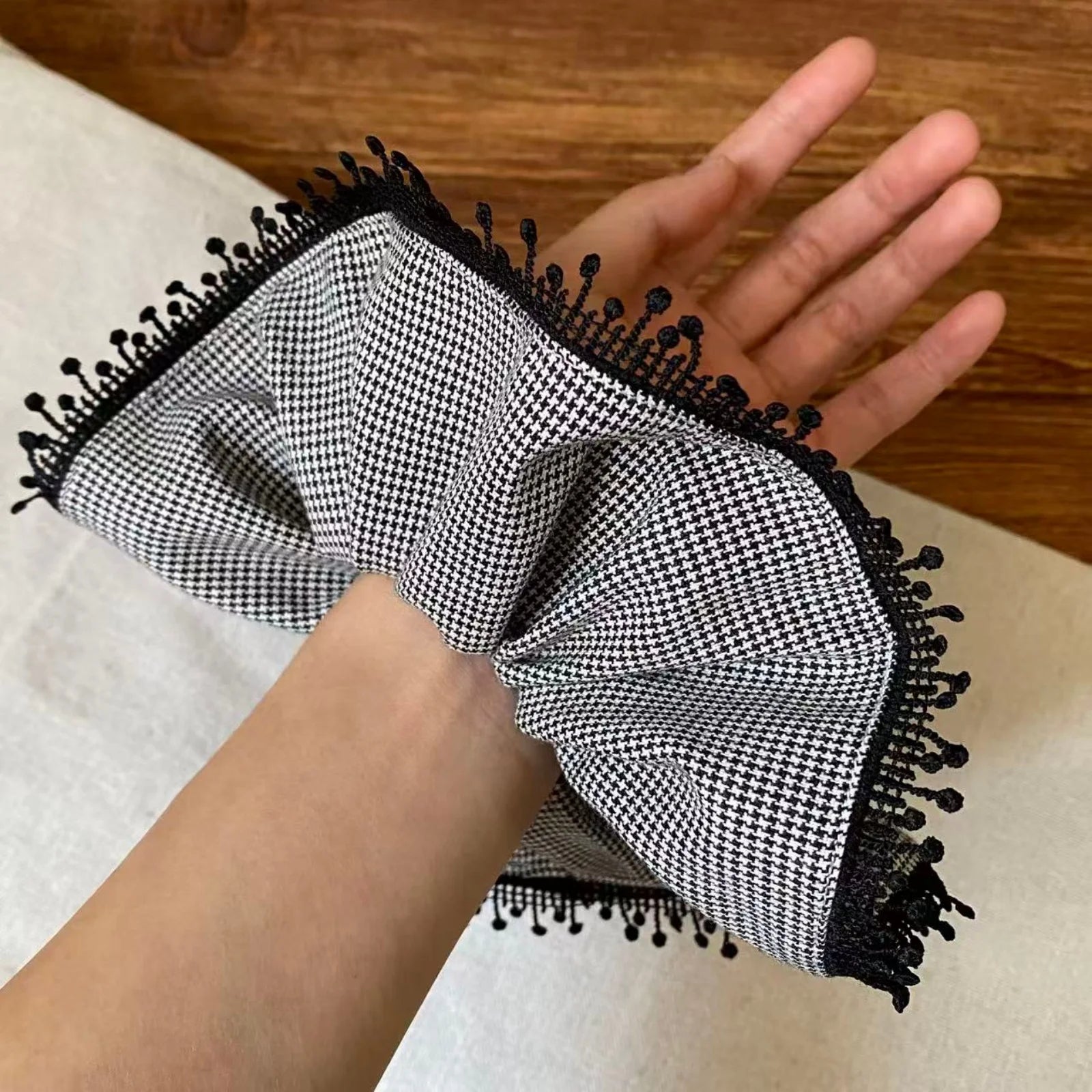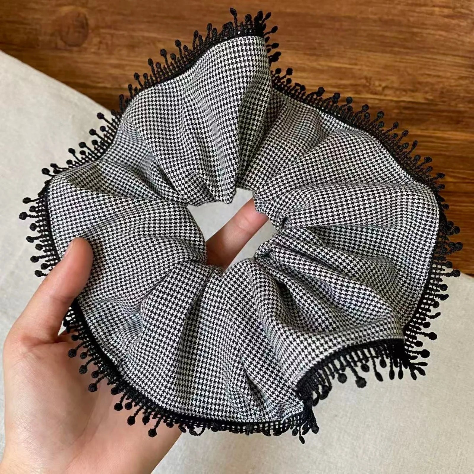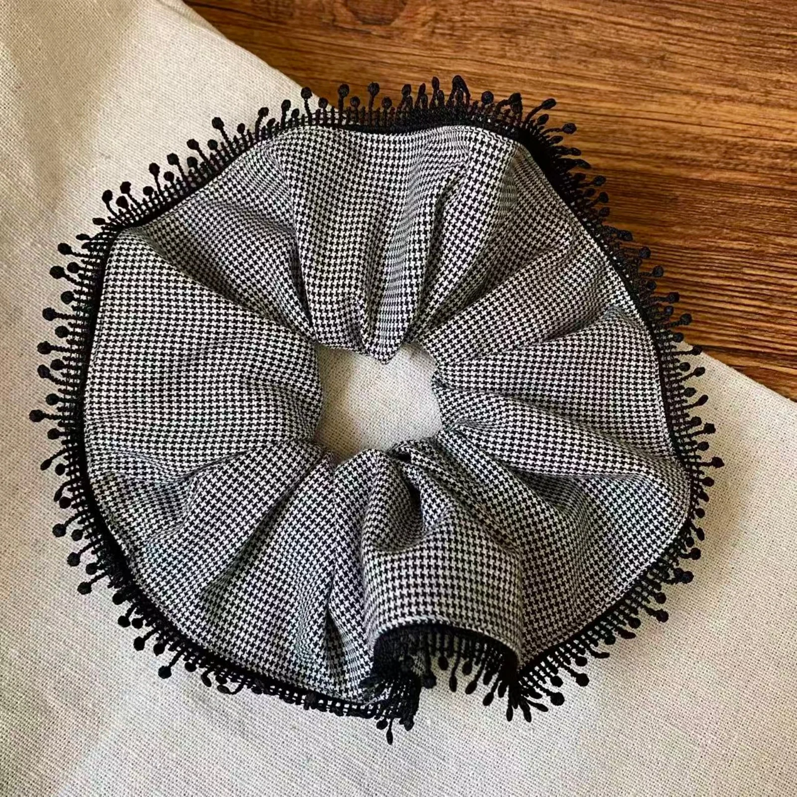 Daiiibabyyy 1PCScrunchies Women's Korean Style New Houndstooth Pattern Hair Accessories With Tassel Edge For Daily, Party, Gift, Fashionable