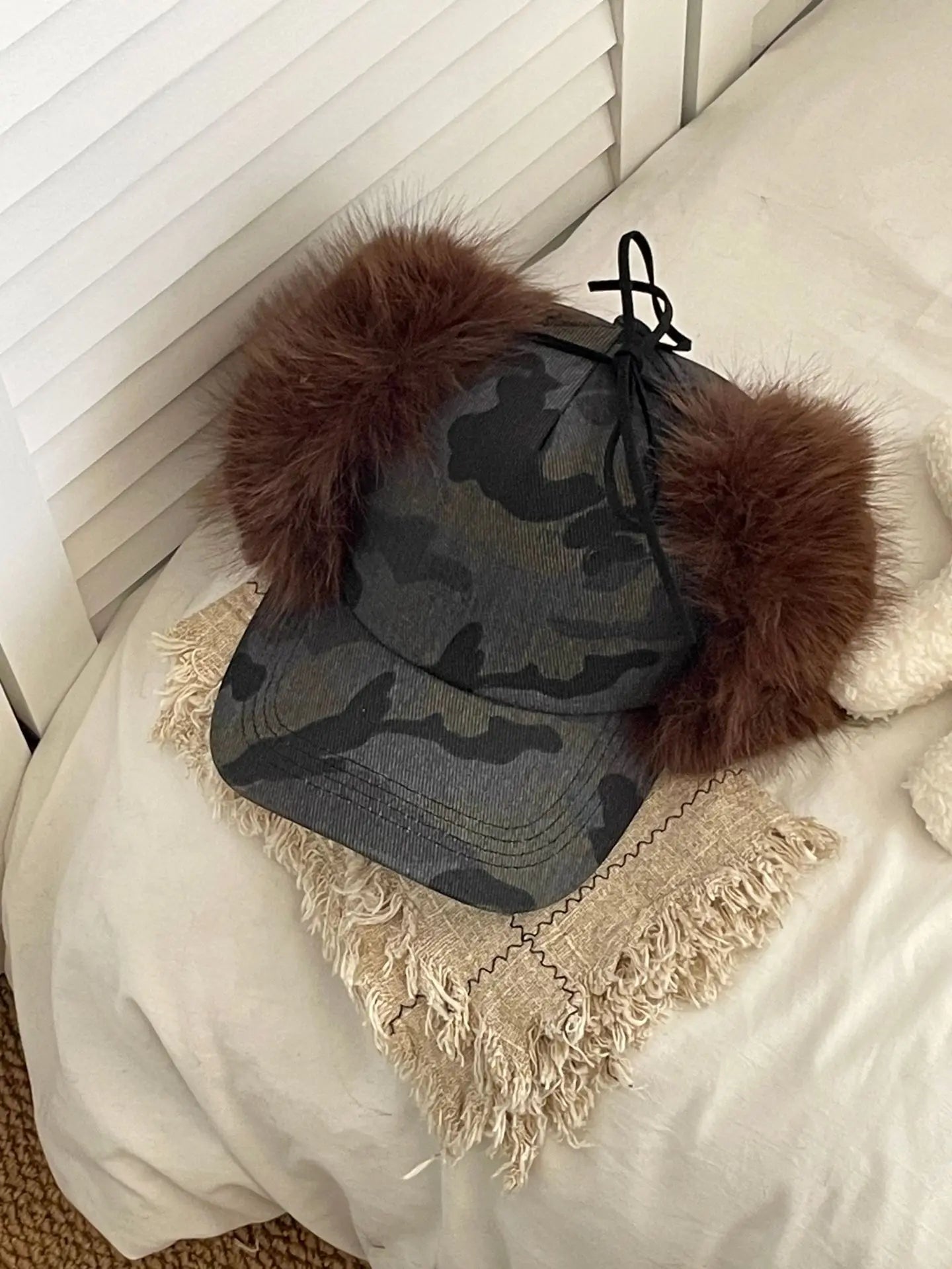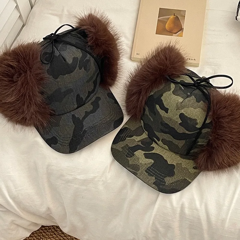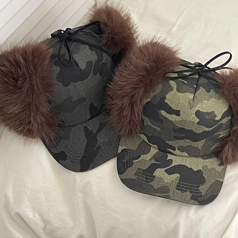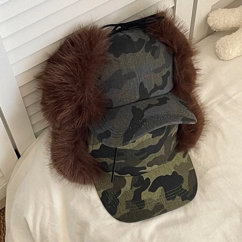 Daiiibabyyy American Y2k Camouflage Imitation Fur Plush Men Baseball Cap Winter Outdoor Thermal Lace-up Ear Protector Women Bomber Hats