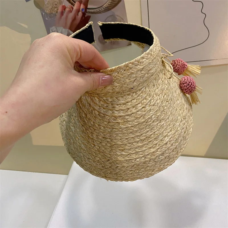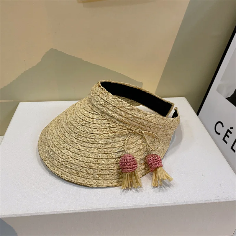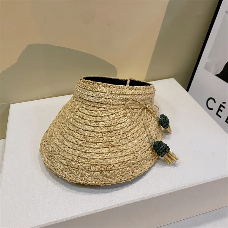 Daiiibabyyy Cute Candy Pendant Decorated Raffia Straw Empty Top Hat Fashionable Seaside Beach Sun Hat UV Protection Visor
