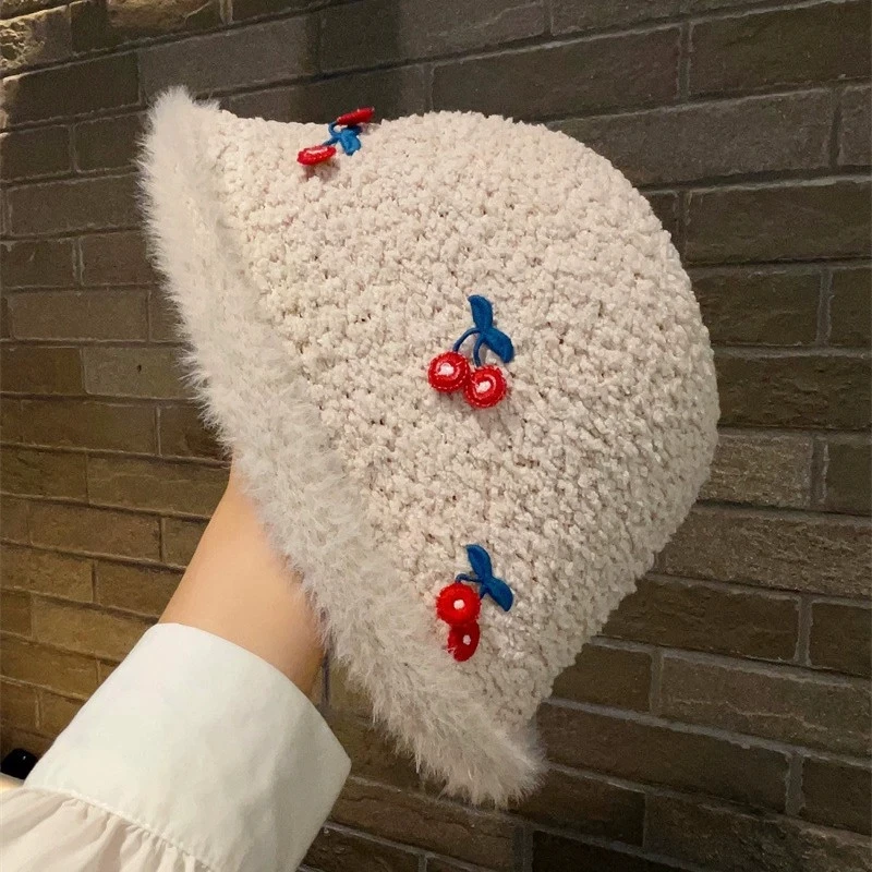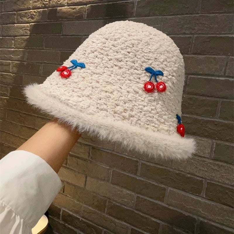 Daiiibabyyy  Cute Cherry White Plush Fisherman Hat for Women Autumn and Winter High-End Hat Warm Bucket Hat