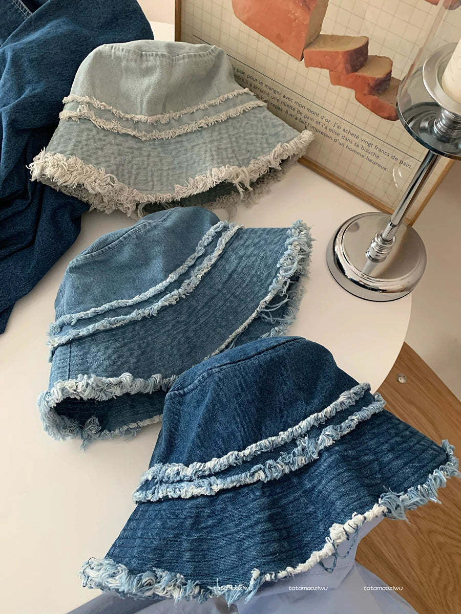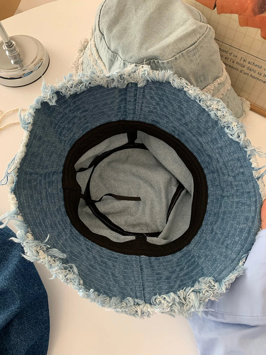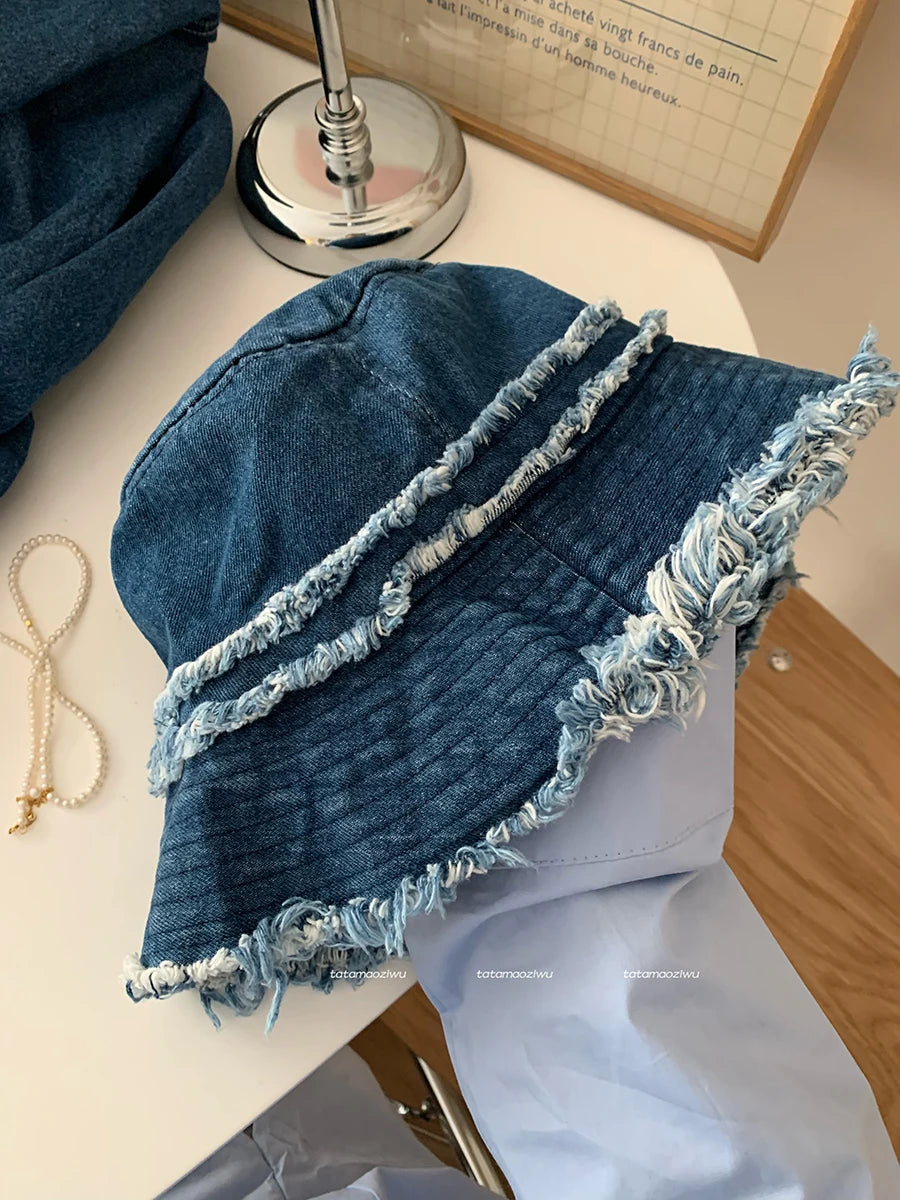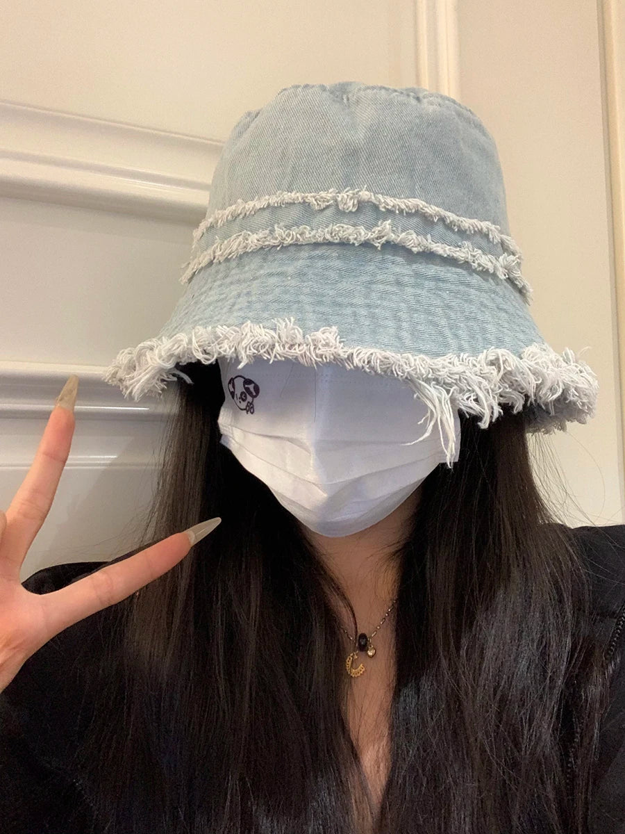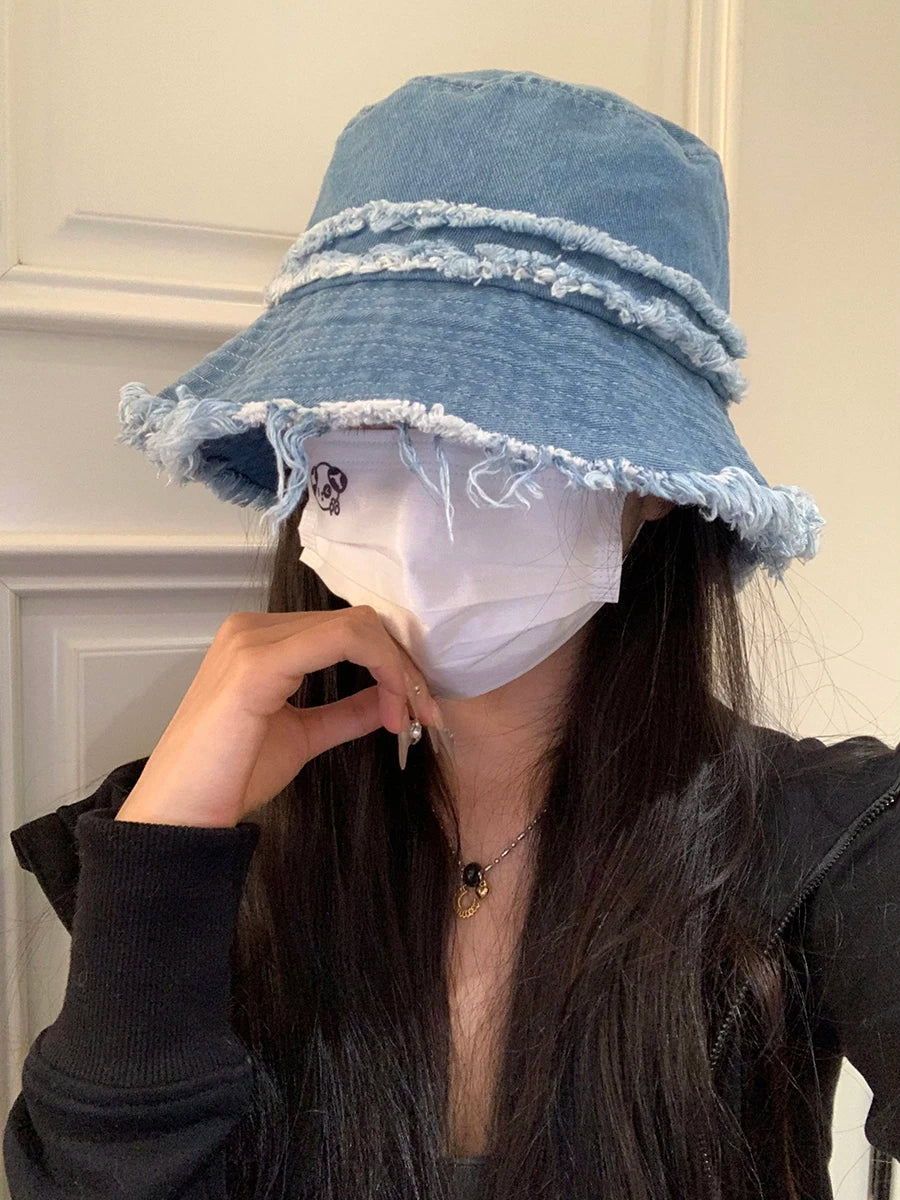Daiiibabyyy Denim Burr Bucket Hat Women's Spring Summer 2024 New Japanese Solid Color Versatile Face Cover Basin Hat Sunshade Bucket Hat