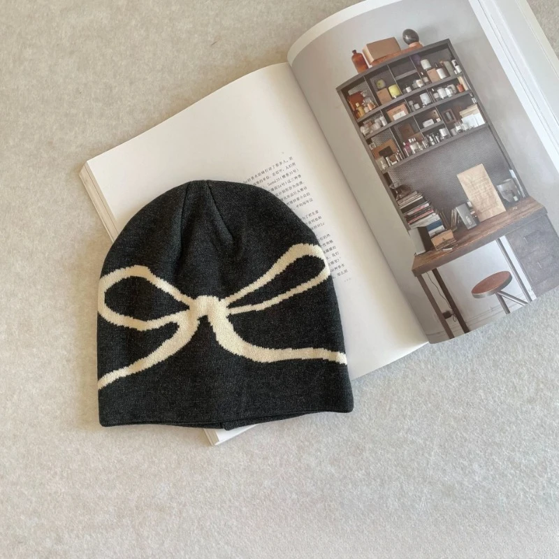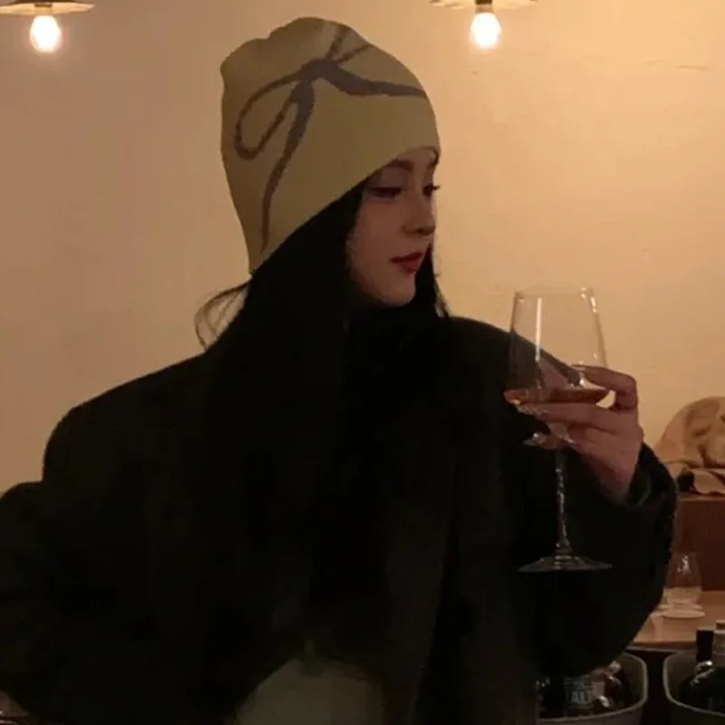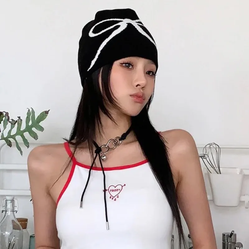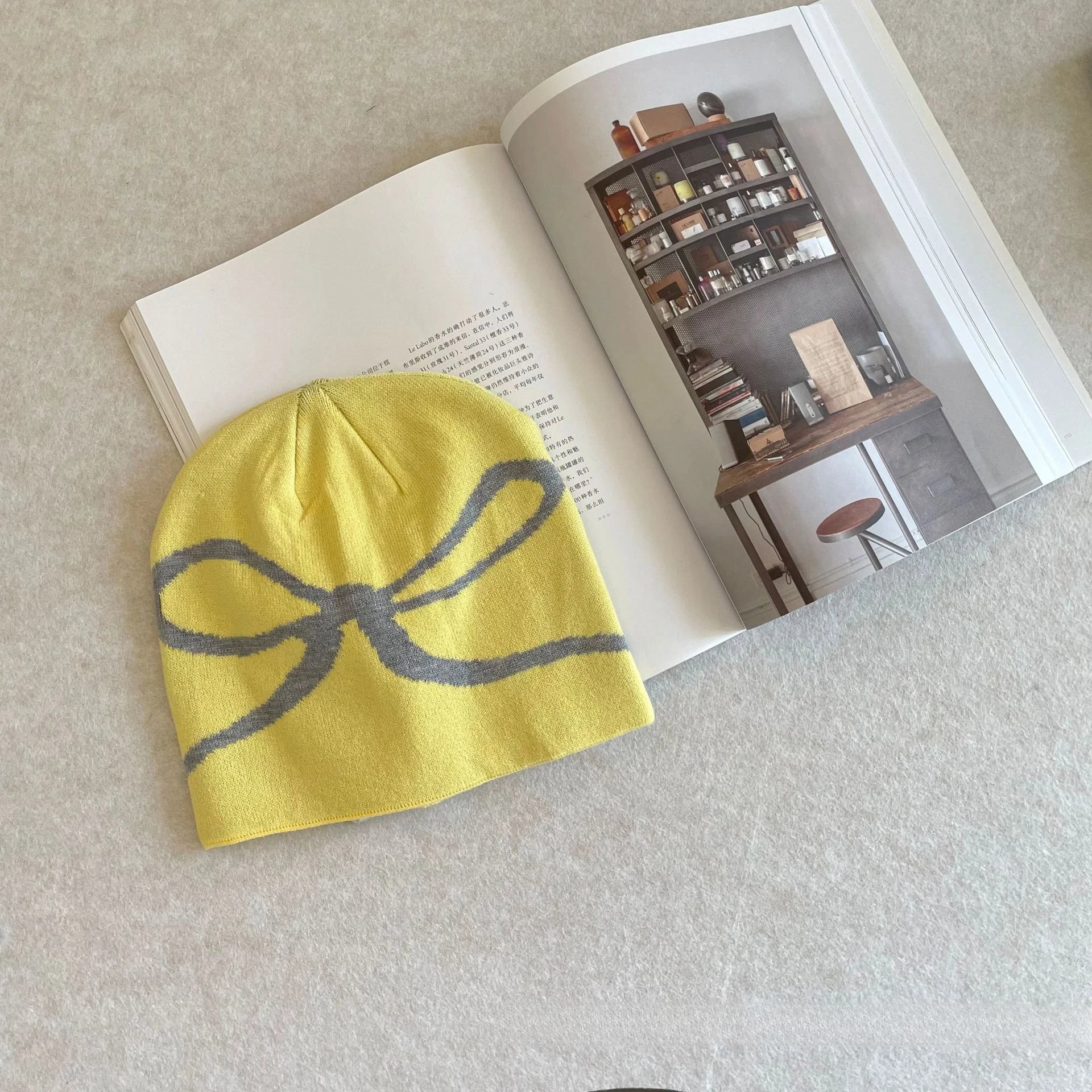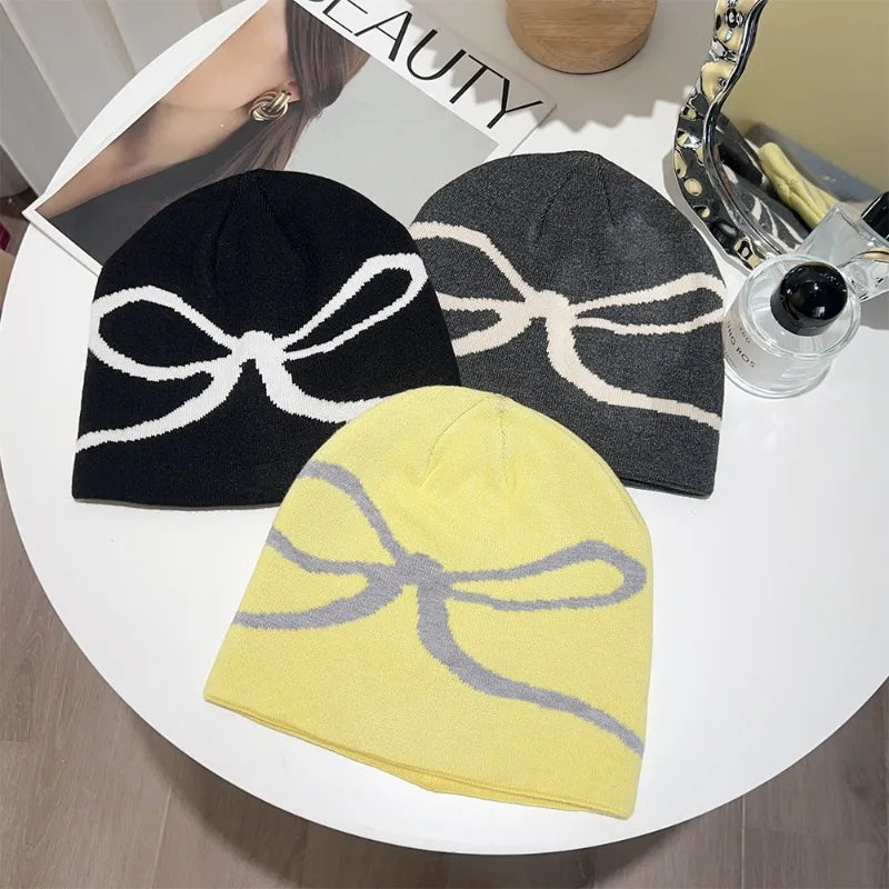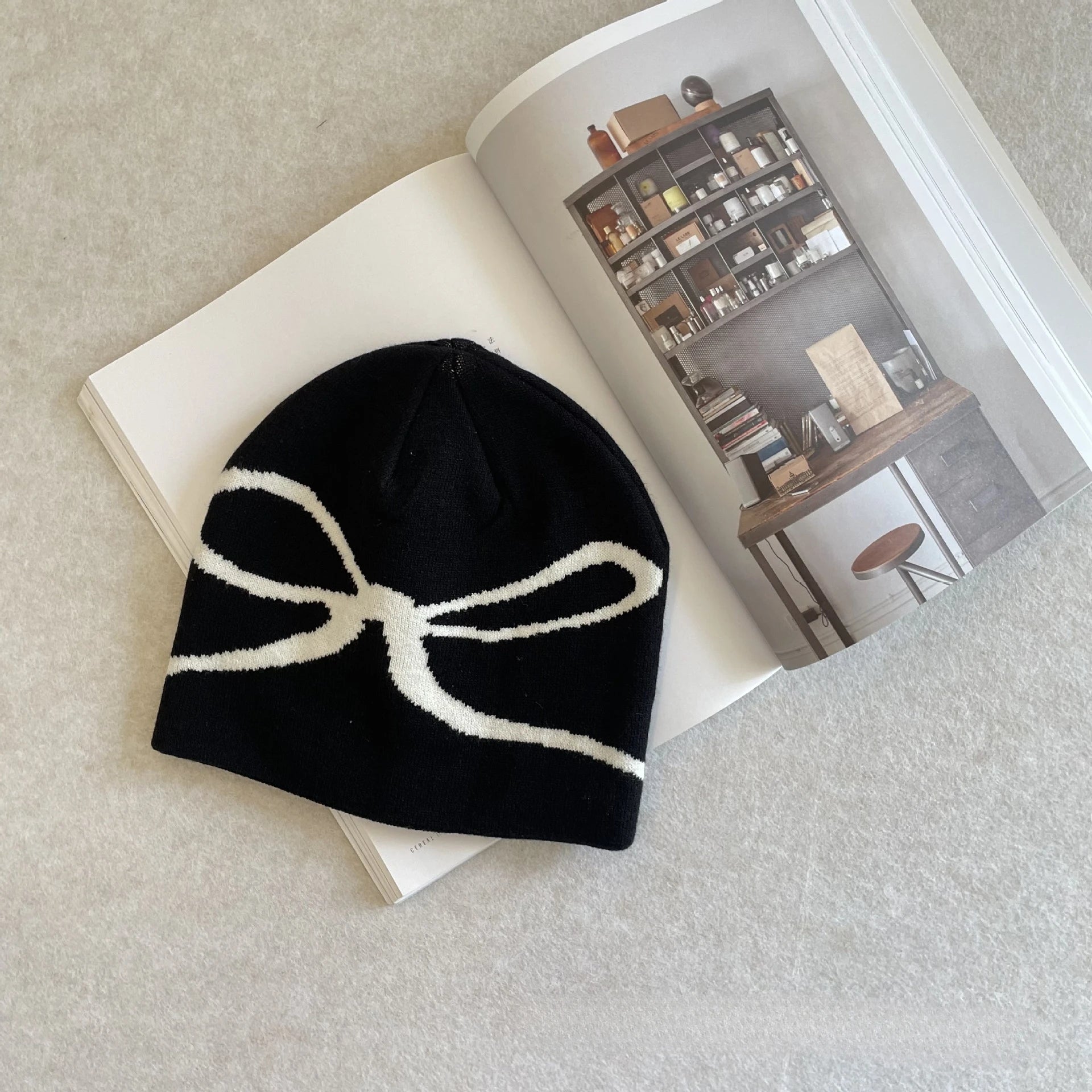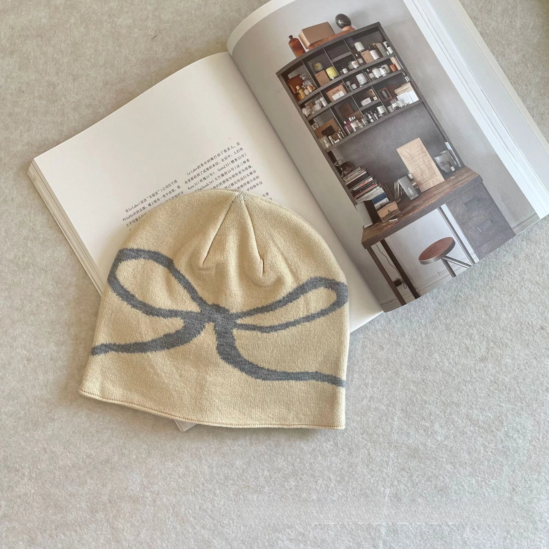 Daiiibabyyy New Korean Fashion Y2k Bow Knitted Skullies Hat Soft Knitted Cap Bow Women Men Couple Beanie Caps Woolen Keep Warm Hats