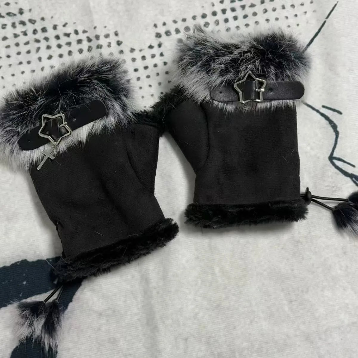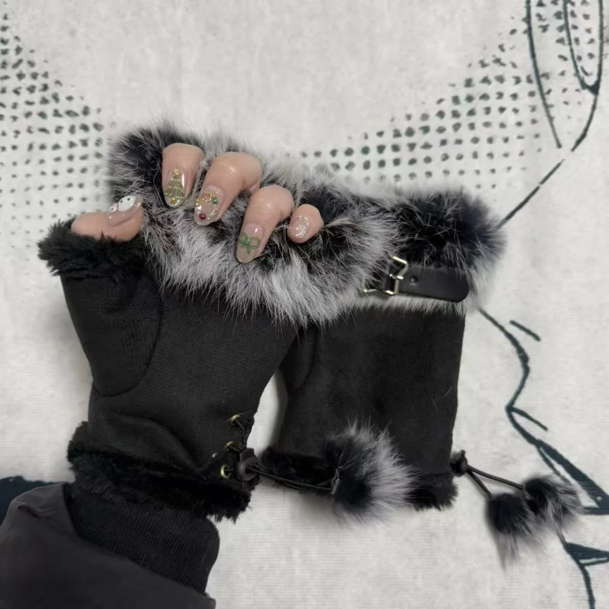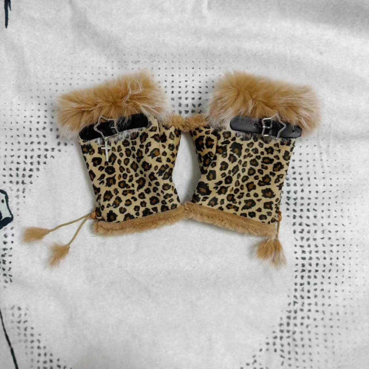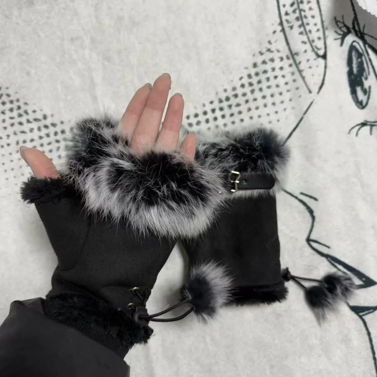 Daiiibabyyy Winter Rabbit Fur Half Finger Sexy Leopard Gloves Fur Suede Adjustable Design Fingerless Y2K Gloves Padded Thickened Outdoor