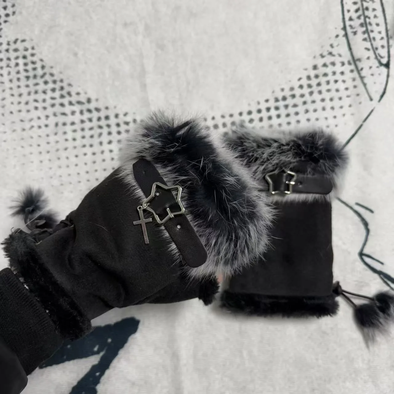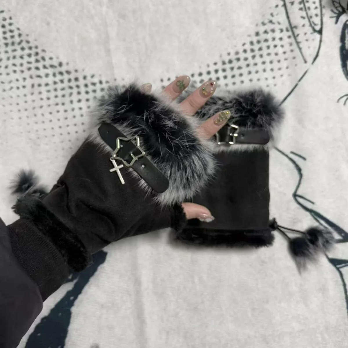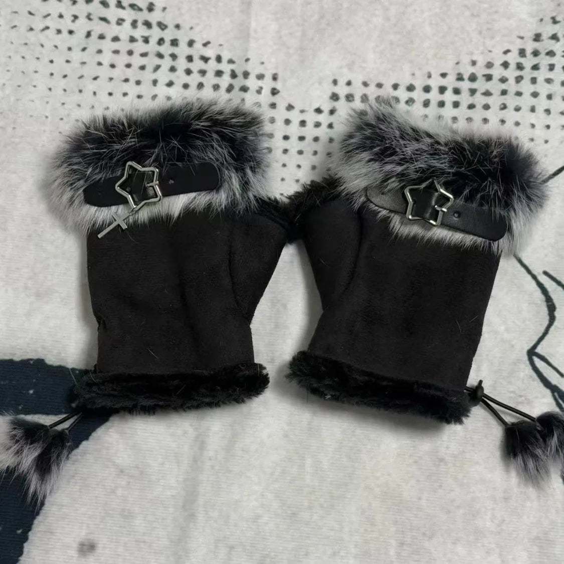 Daiiibabyyy Winter Rabbit Fur Half Finger Sexy Leopard Gloves Fur Suede Adjustable Design Fingerless Y2K Gloves Padded Thickened Outdoor