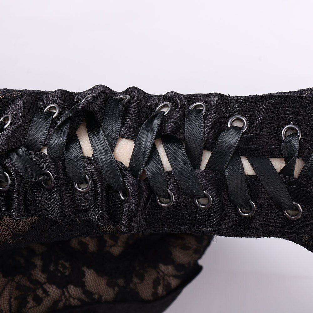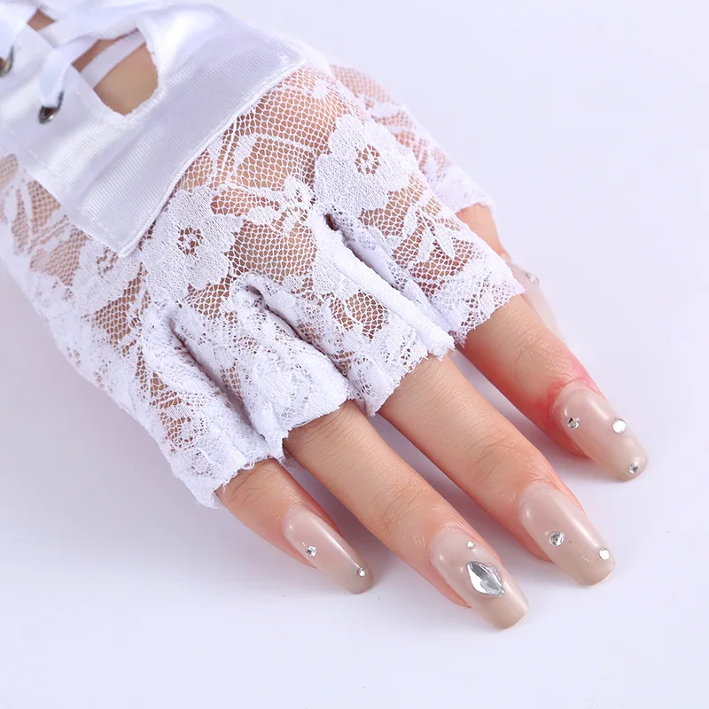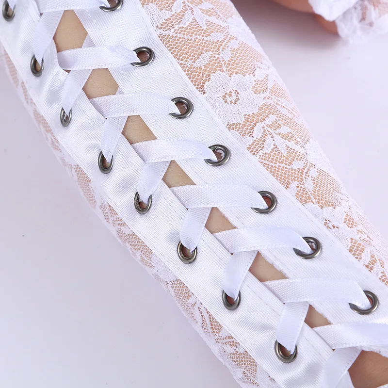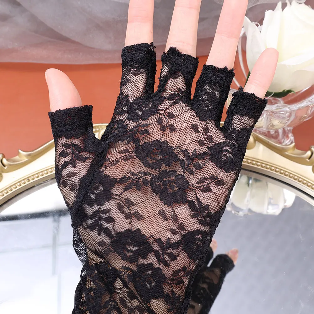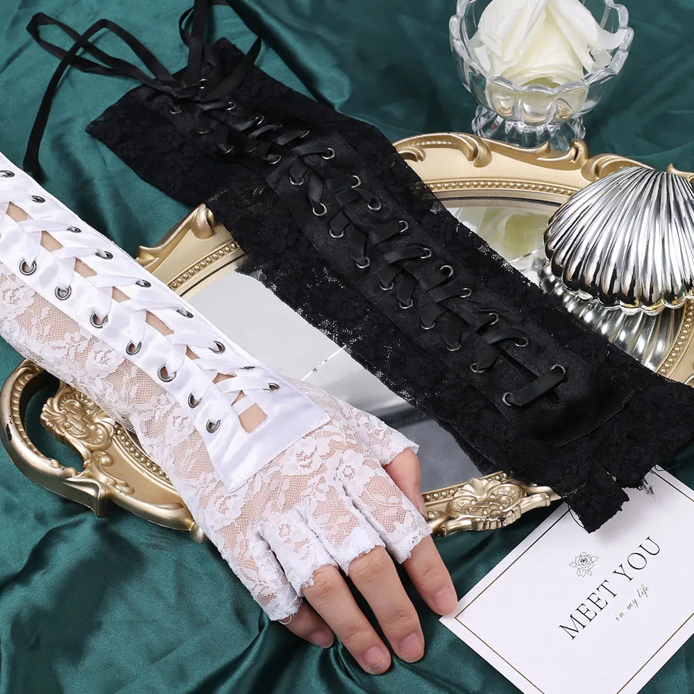 Daiiibabyyy Women Sexy Floral Lace Elbow Length Half-Finger Gloves Black String Ribbon Ties Up Dance Party Fingerless Fishnet Mesh Mittens