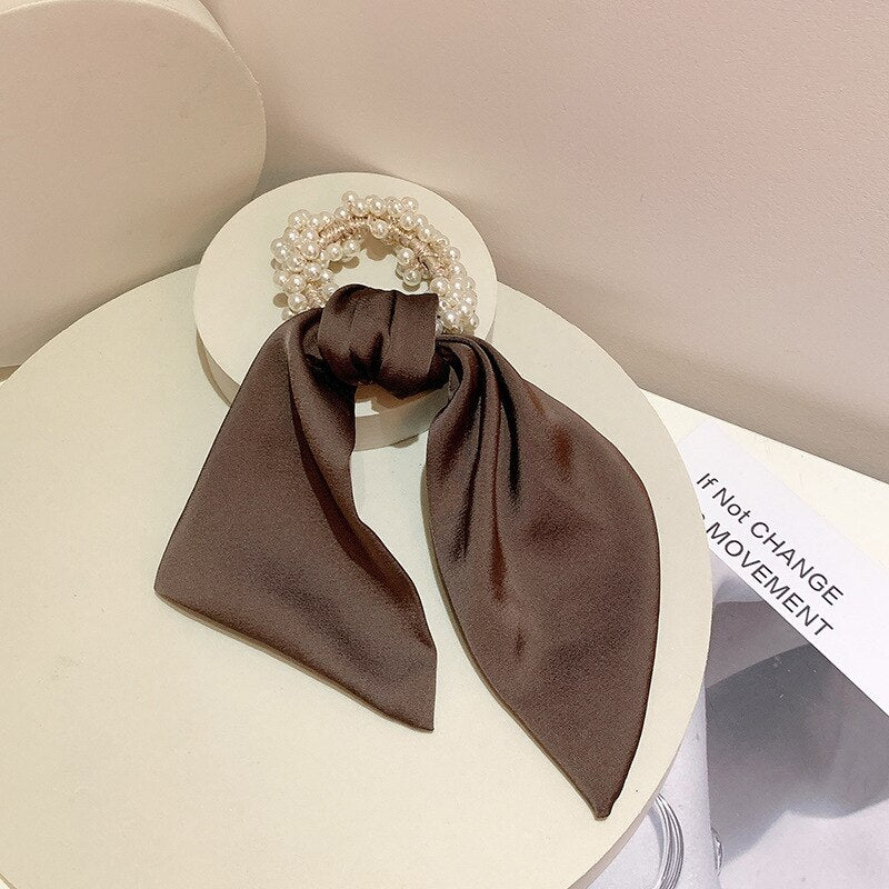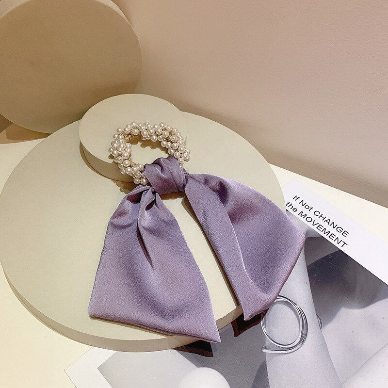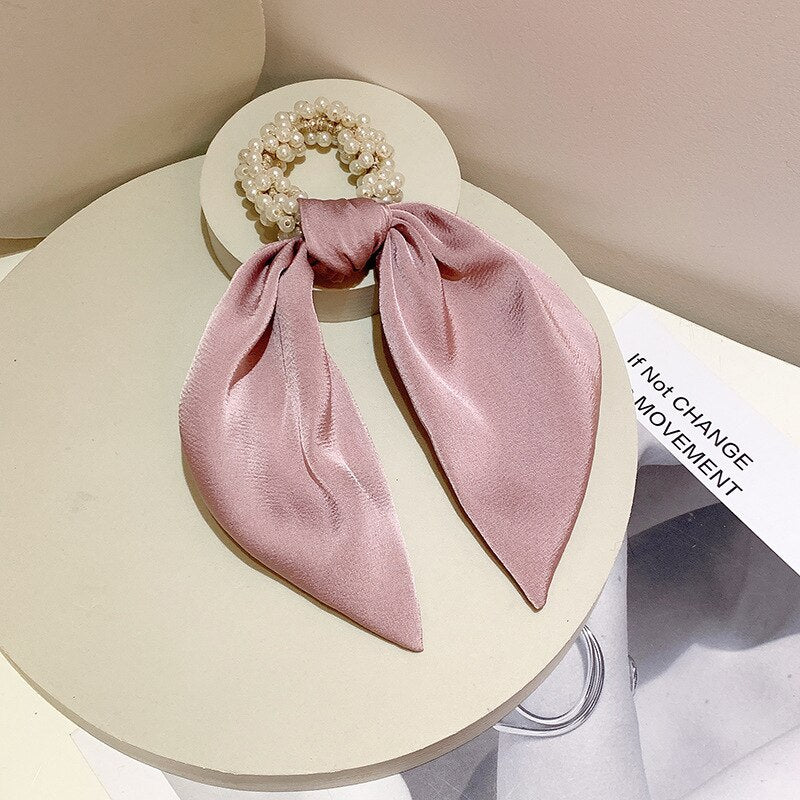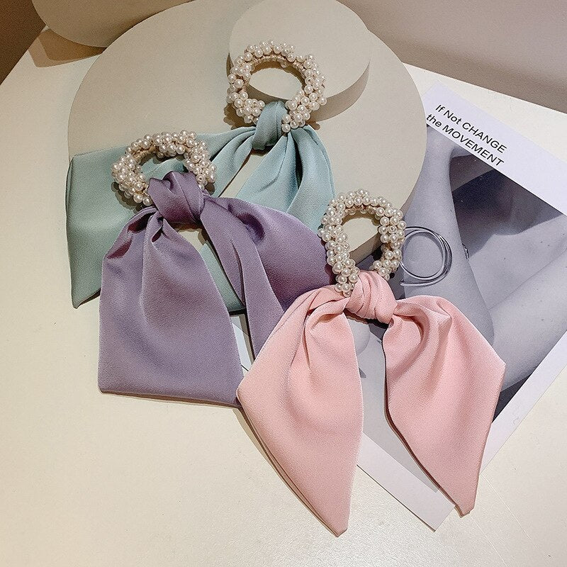 Solid Color Bow Streamers Hair Rope Ponytail Holder Hair Scarf Bowknot Elastic Hair Bands Ribbon Pearl Hair Scrunchies