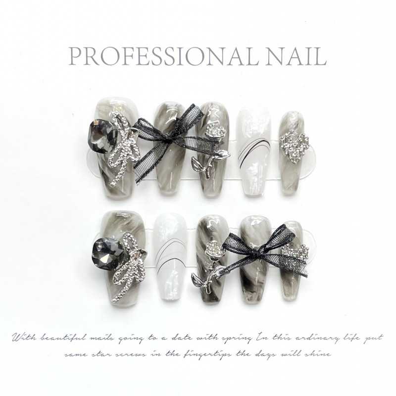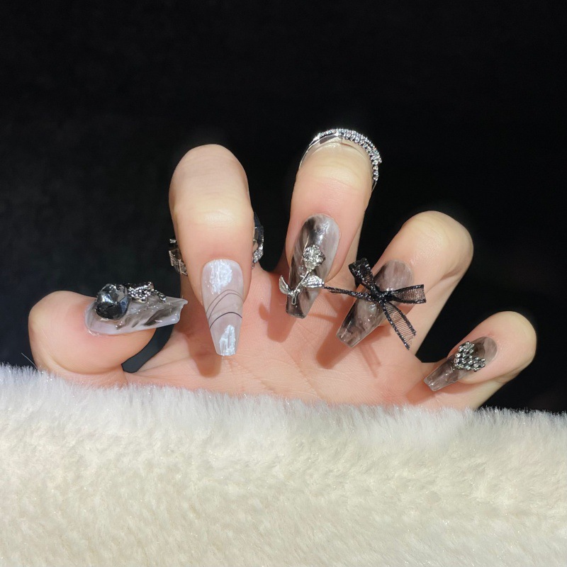Daiiibabyyy 10pc Detachable Handmade Black Butterfly French Long Coffin Acrylic Press on Nails Ballet Fake Nails with Glue Artificial Nail