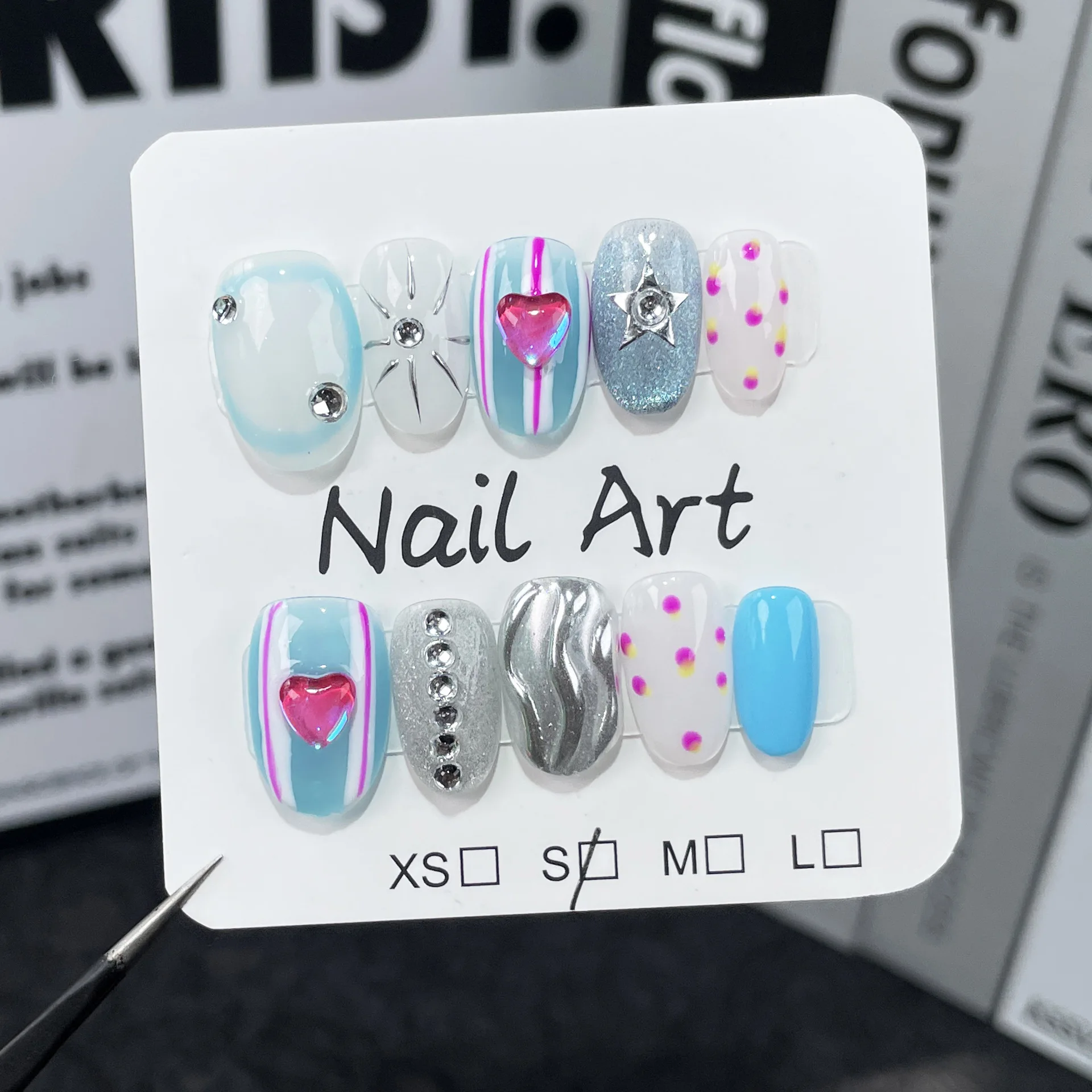 Daiiibabyyy 10PCS Blue Press on Nails Short Round Fake Nails with Glue Y2k Sweet Cool Cute False Nails with Designs Y2k Metal Handmade Nails