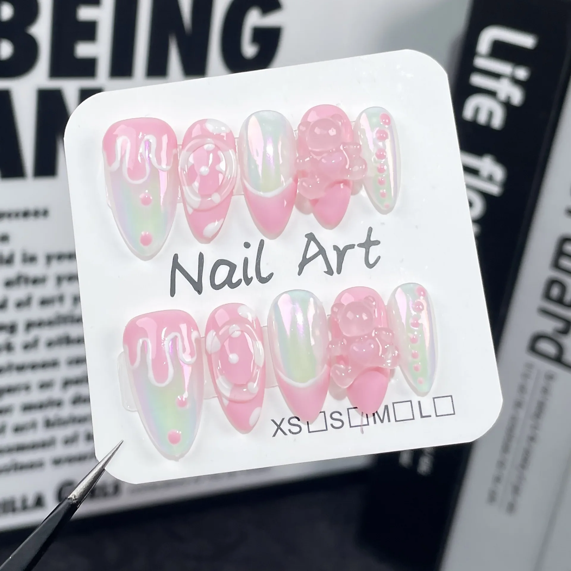 Daiiibabyyy 10Pcs Cute Aurora Almond Handmade Press on Nails y2k Spicy Girl False Nails with 3D Bear Detachable Full Cover Fake Nail Tips
