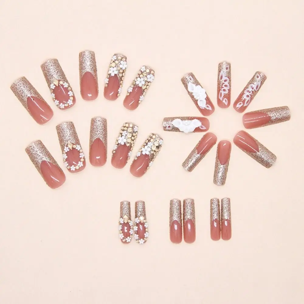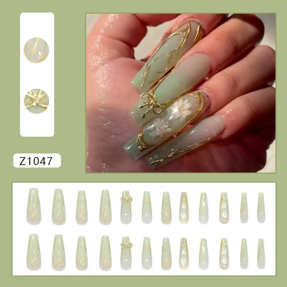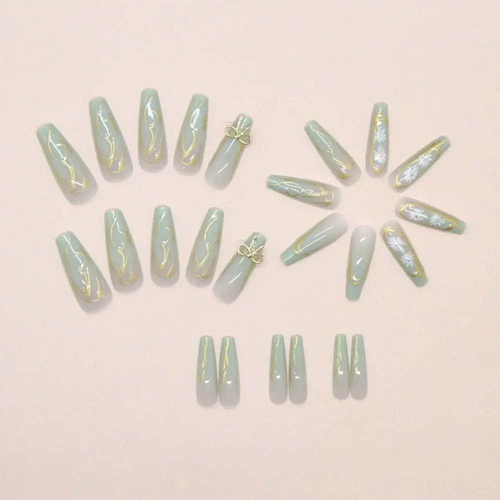 Daiiibabyyy  24pcs Detachable Long Water Pipe False Nails French Sparkling Rhinestone Nail Tips Full Cover Green Daisies Press on Nails DIY