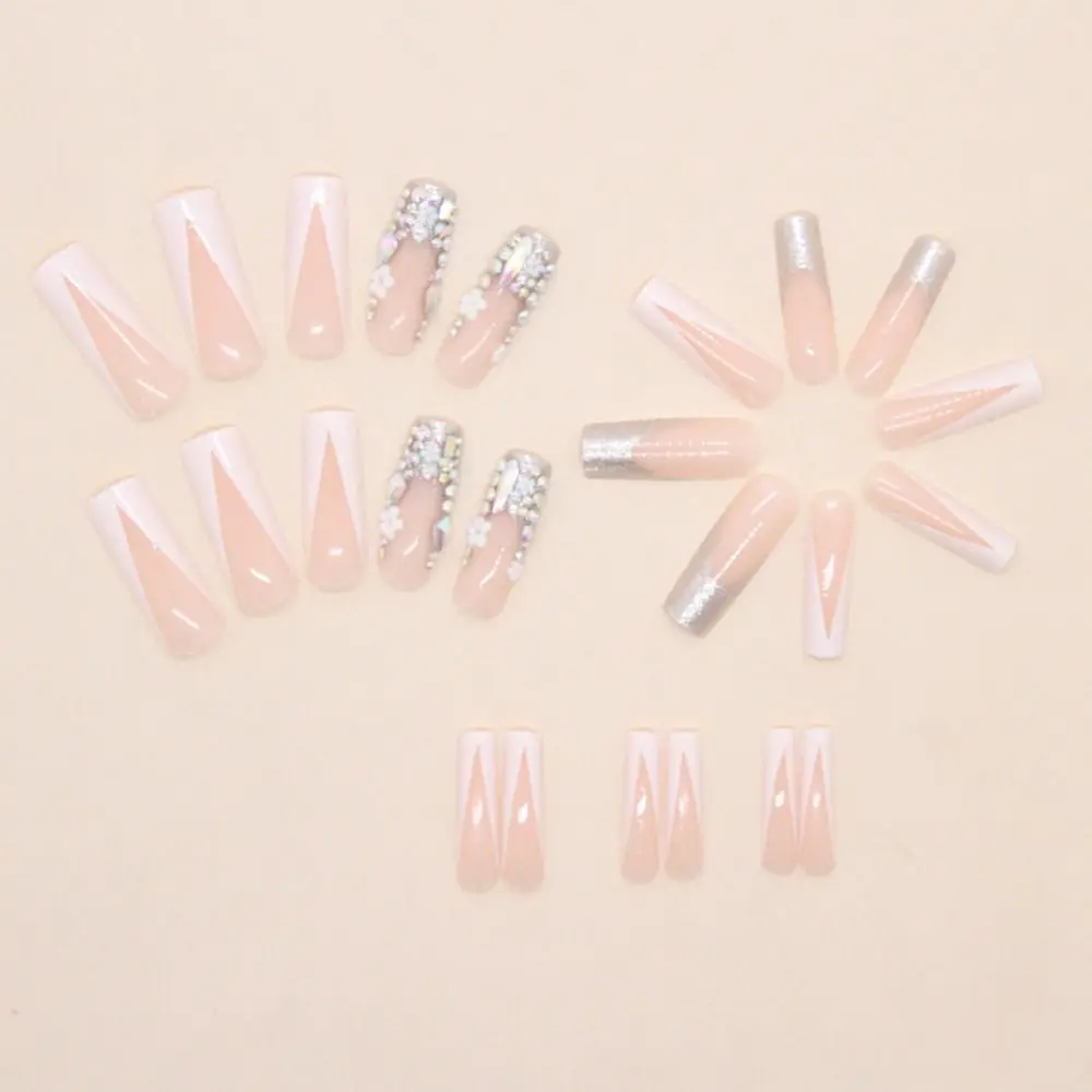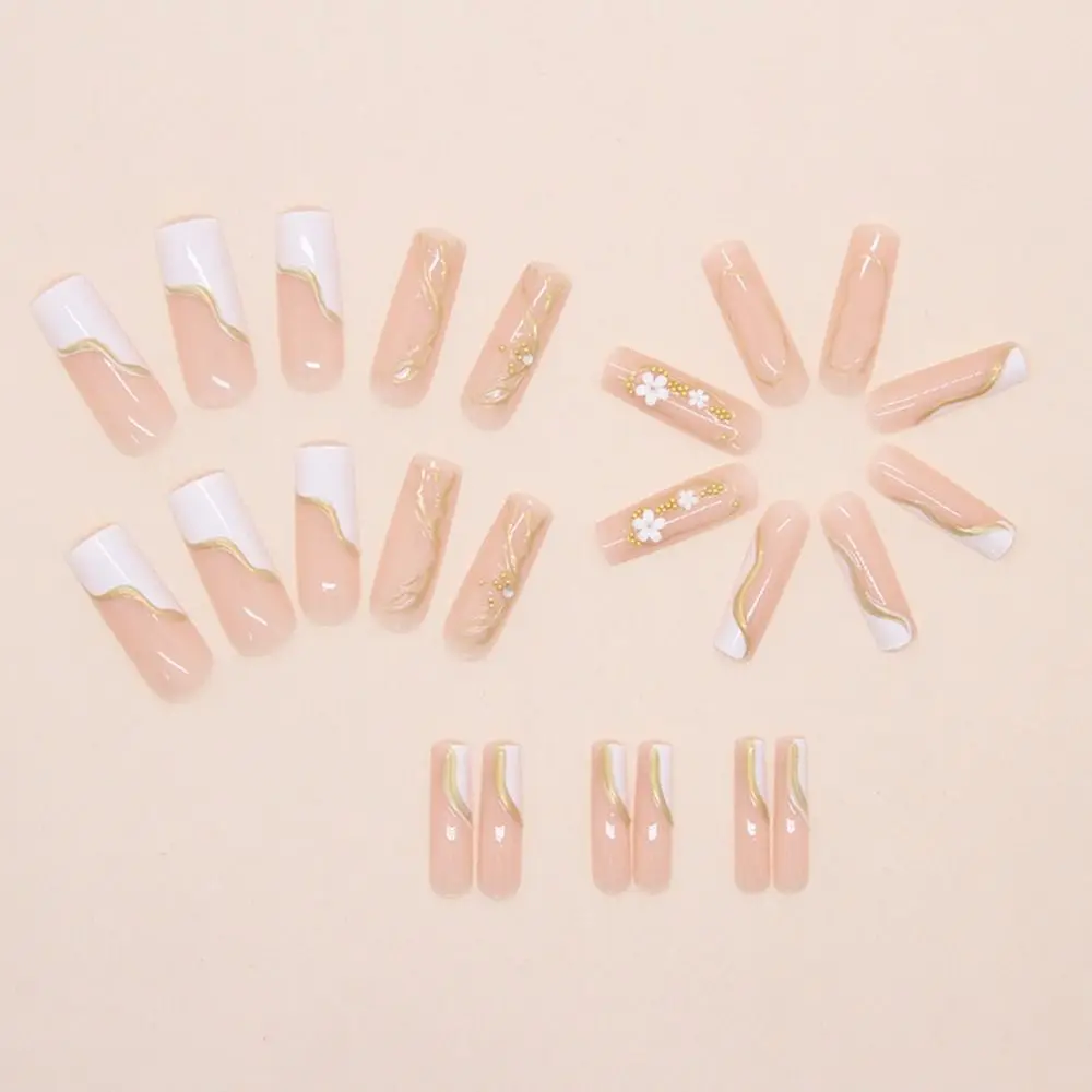 Daiiibabyyy 24pcs Detachable Long Water Pipe False Nails French Sparkling Rhinestone Nail Tips Full Cover Green Daisies Press on Nails DIY