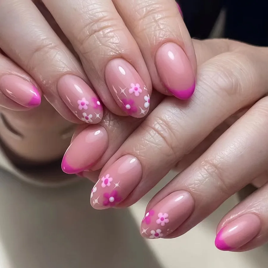 Daiiibabyyy 24pcs Flower Design Press on Nails Art Simple Long Almond Glitter Cat's Eye False Nail Reusable Rhinestone Pink Purple Fake Nail