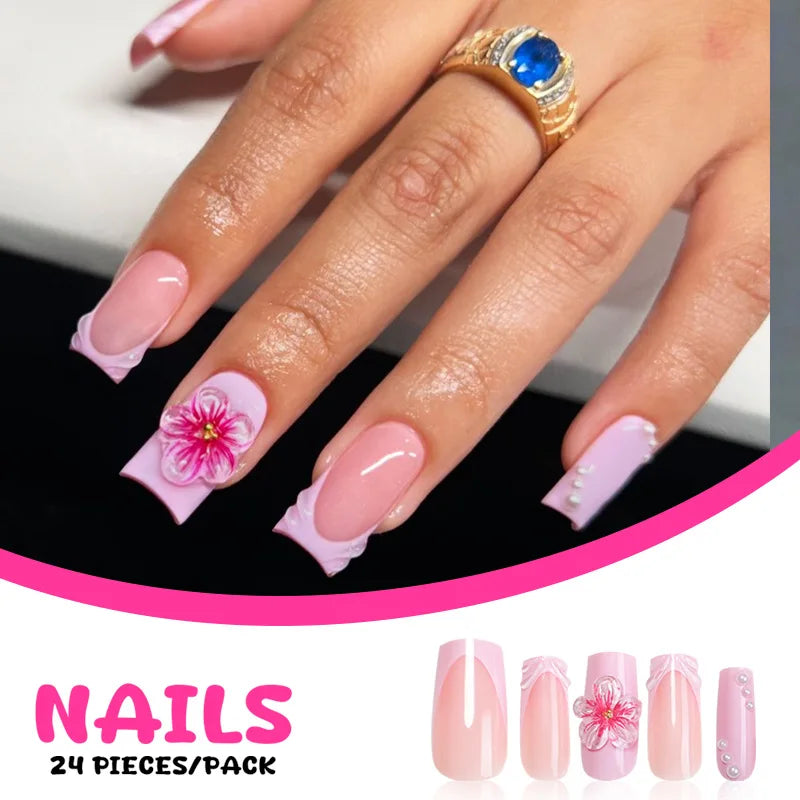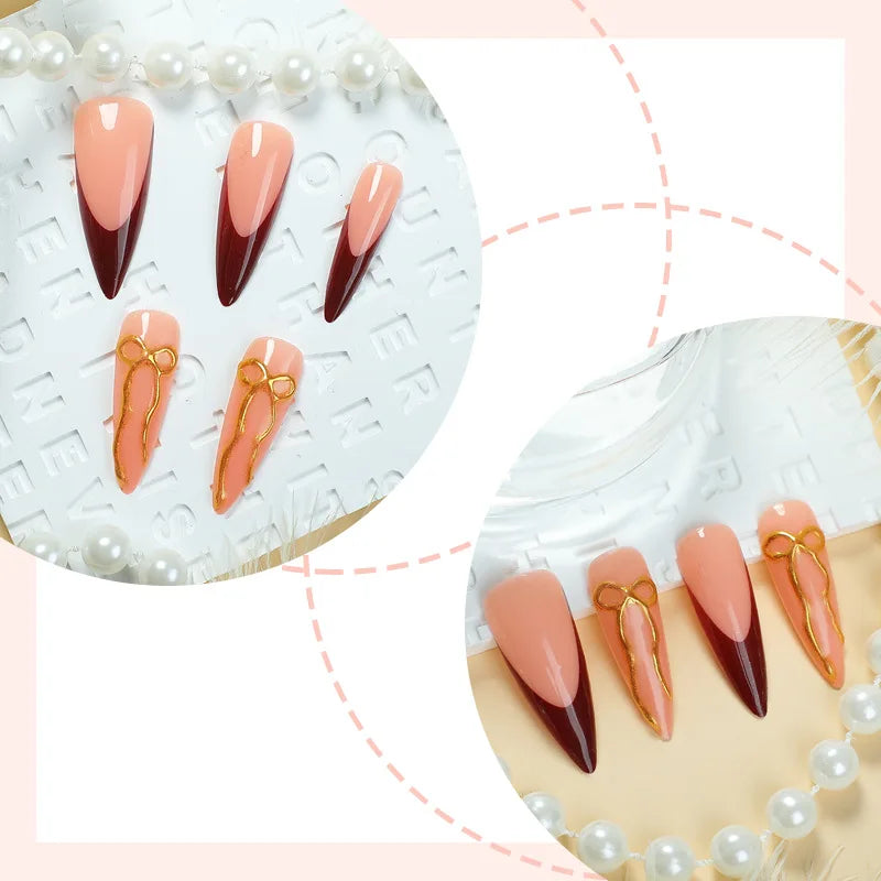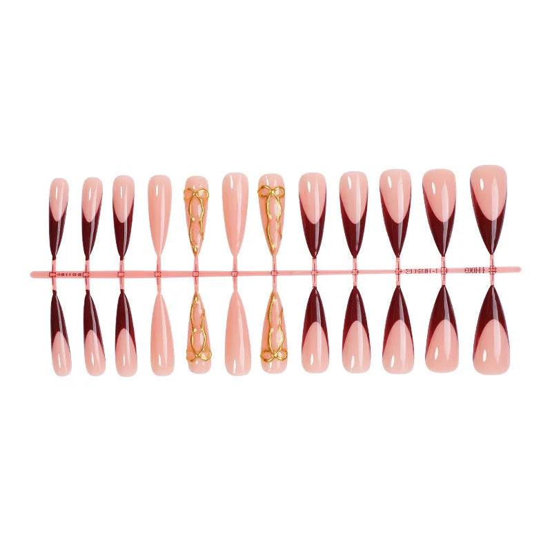 DAIIIBABYYY - 24pcs Long Almond Fake Nails Autumn Gold Bow Decor Press on Nails Full Cover Wearable Retro Deep Brown French False Nail Tips