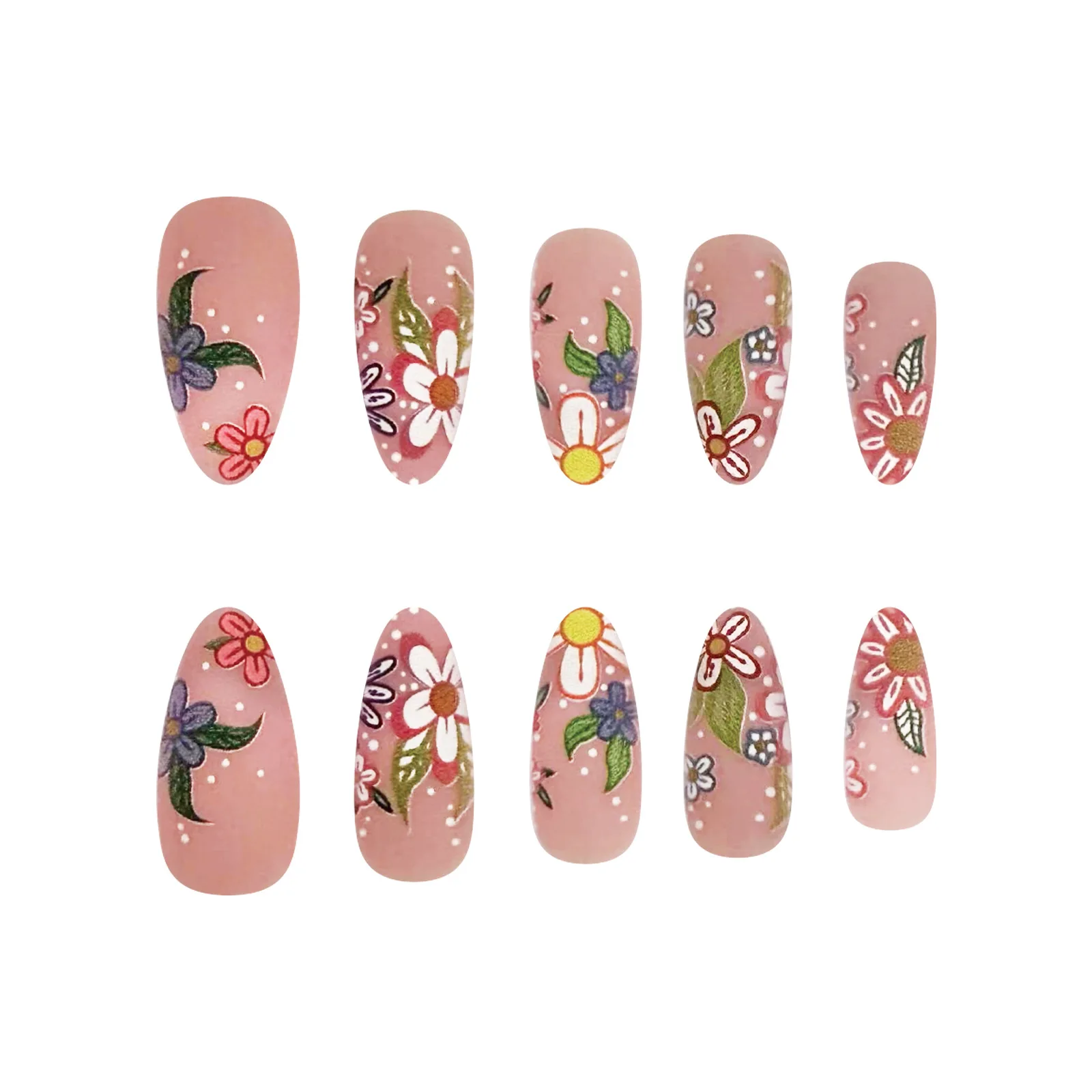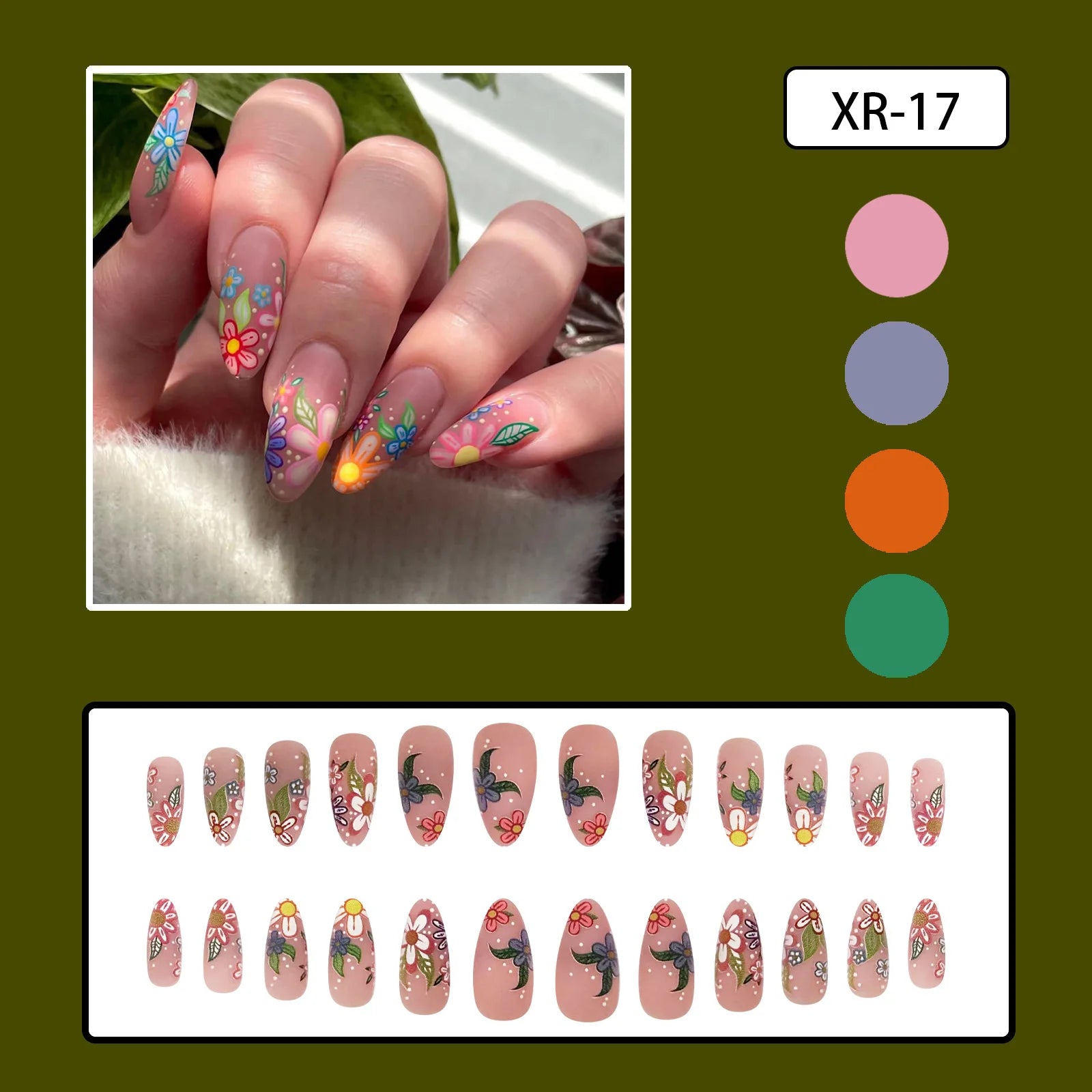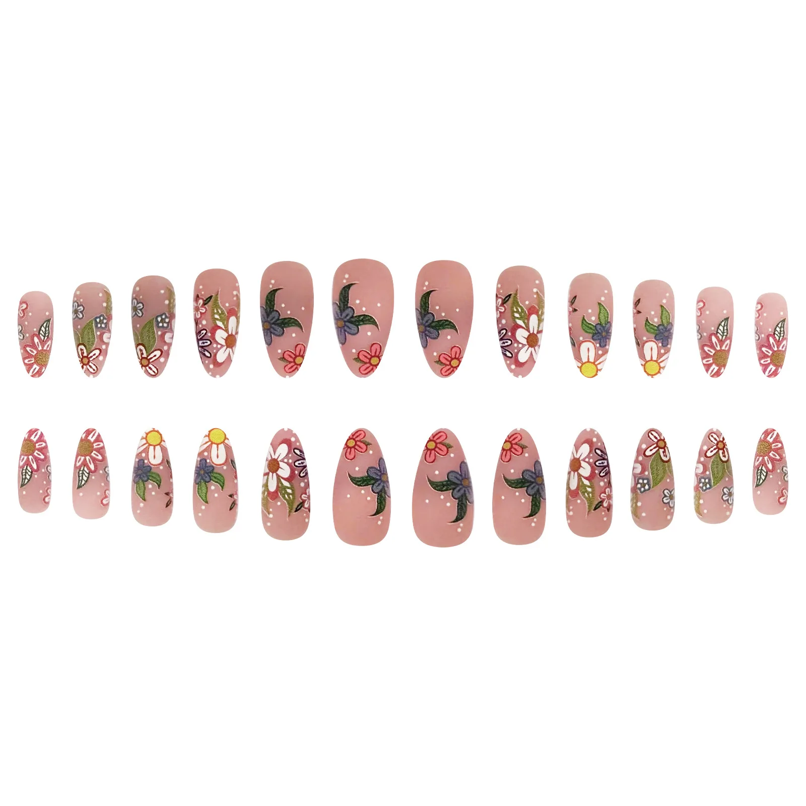 DAIIIBABYYY - 24pcs Spring/Summer Flowers Fake Nail Colorful flower Pattern False Nails Full Cover Wearable Sweet Korean Almond Press On Nails