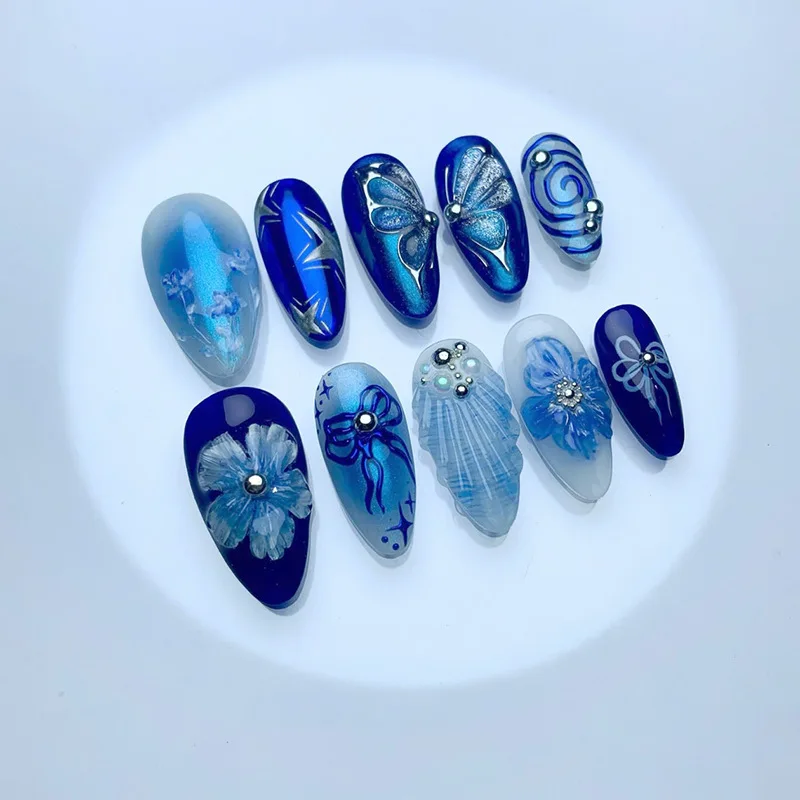 Daiiibabyyy 24pcs Wearable False Nail Butterfly Colorful Almond Nails Sets Press on Finished Ocean Star Flower Design Long Fake Nails Tips