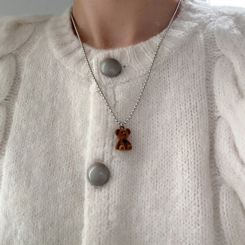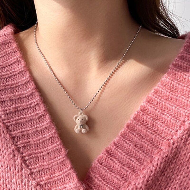 Daiiibabyyy Cute Brown Flocking Bear Pendant Necklaces Women Girls Lovely Bears Charm Pendant Sweater Chain Necklace Jewelry Gift