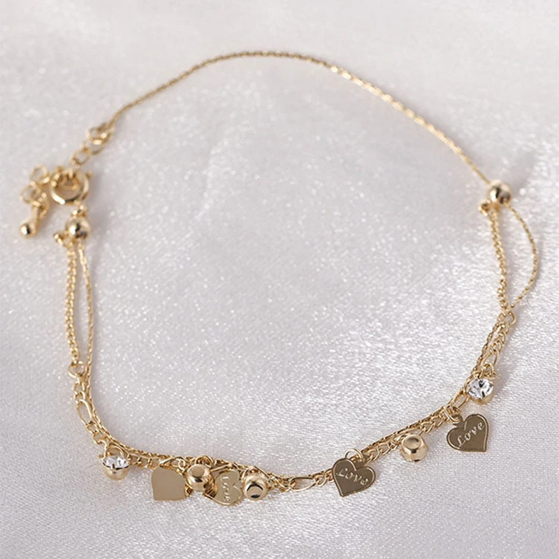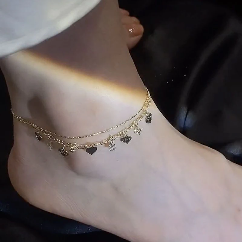 DAIIIBABYYY  -   Double Layer Heart-shaped Flash Drilling Women Anklets Personality All-match Adjustable Fashion Beads Foot Jewelry Accessories
