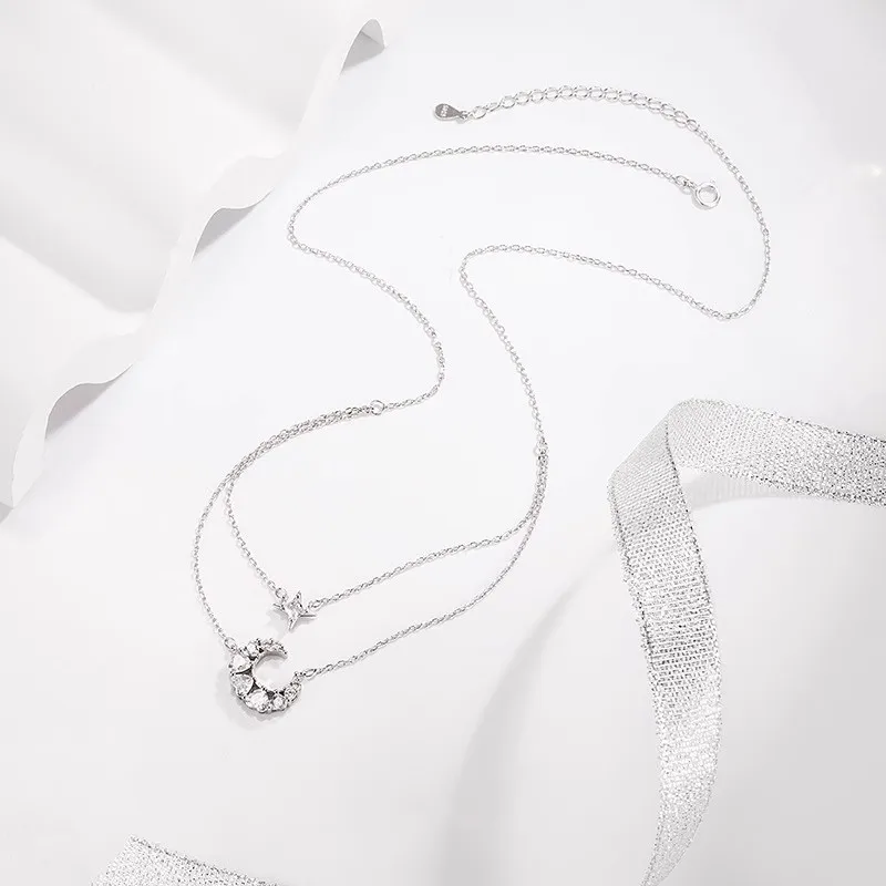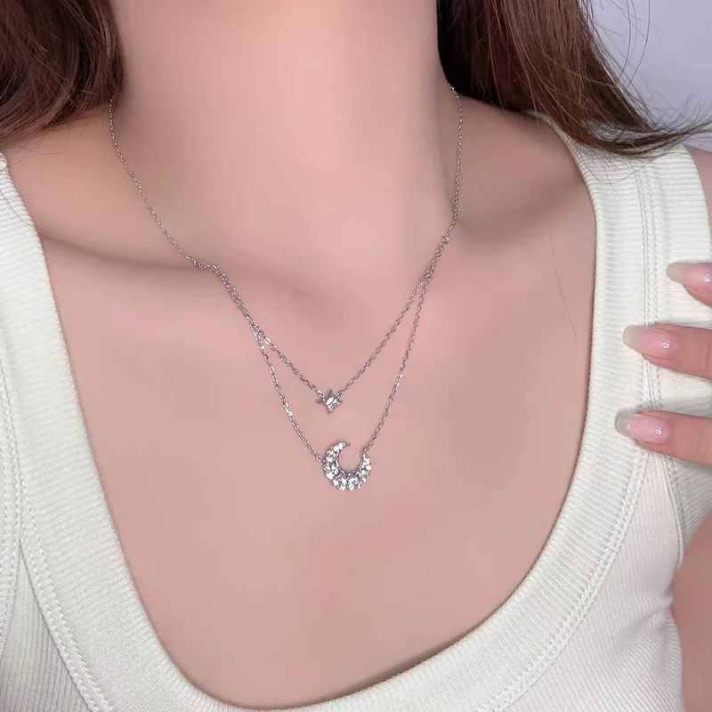 Daiiibabyyy New 925 Sterling Silver Luxury Zircon Double Layer Moon Pendants Choker Necklaces For Women Wedding Gift Fine Jewelry